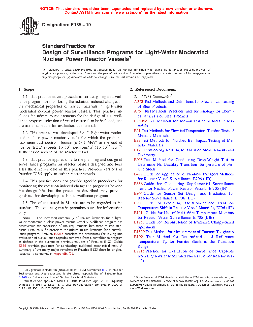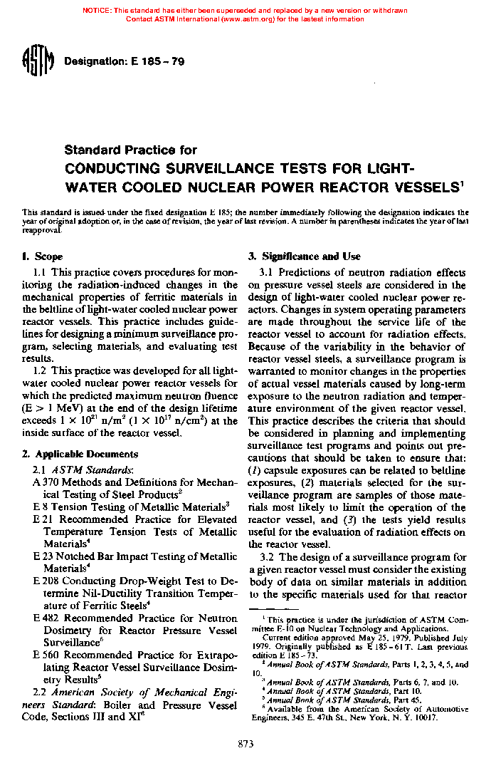 1.2 This practice was developed for all light-water cooled nuclear power reactor vessels for which the predicted maximum neutron fluence ( > 1 MeV) at the end of the design lifetime exceeds 1 X 10 17 n/cm (1 X 10 21 n/m ) at the inside surface of the reactor vessel.