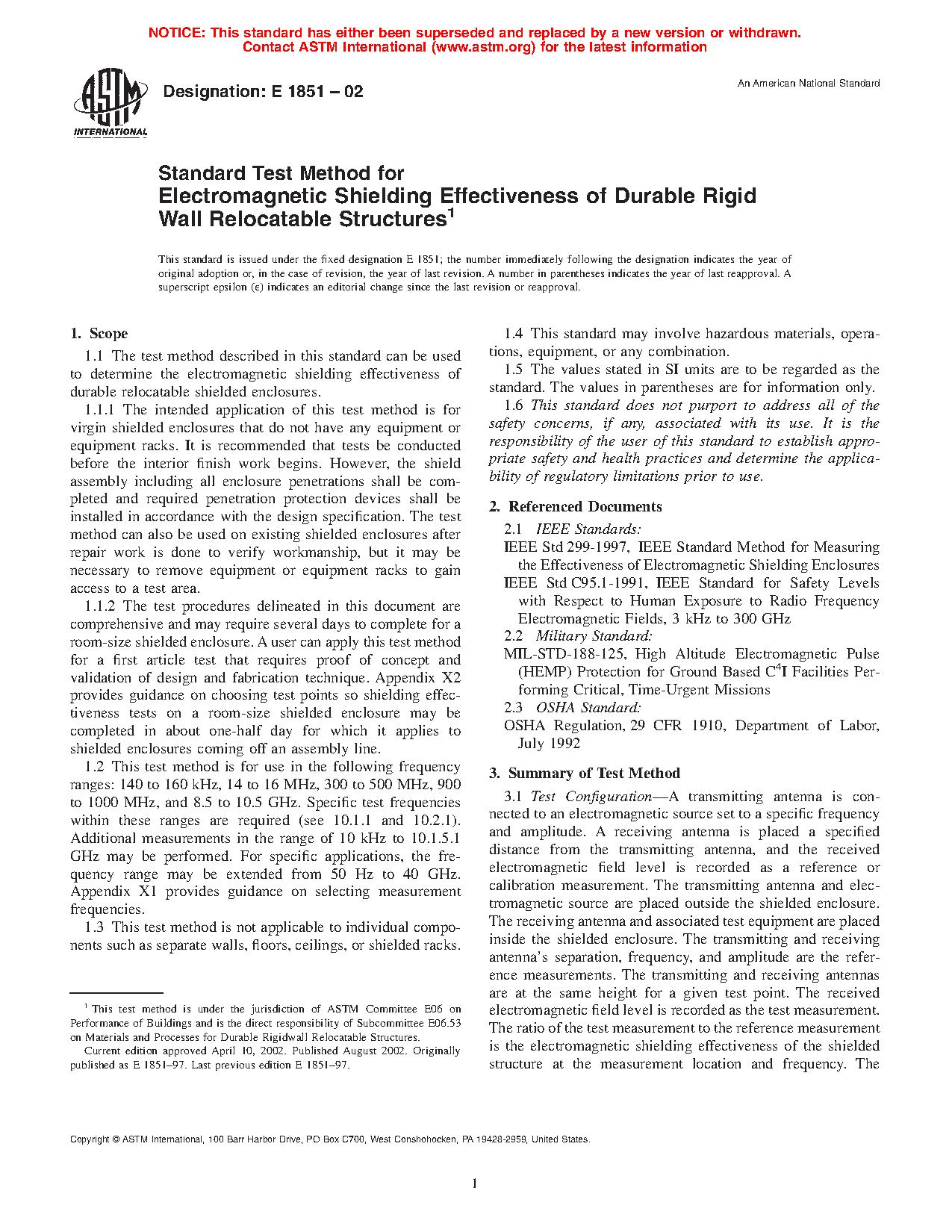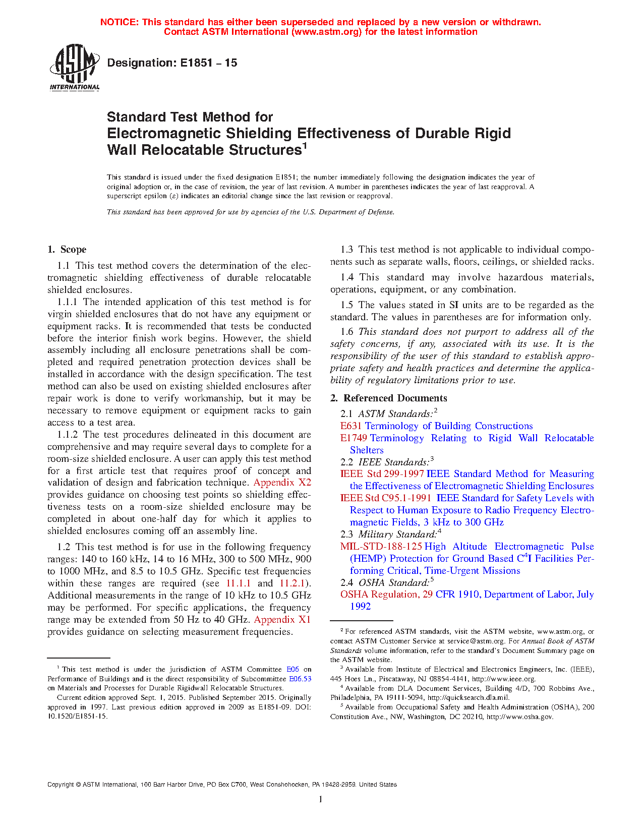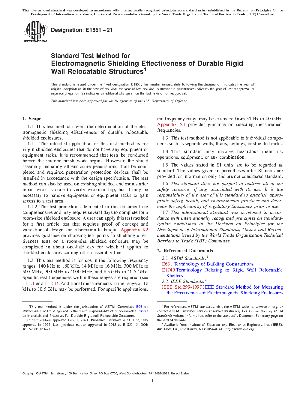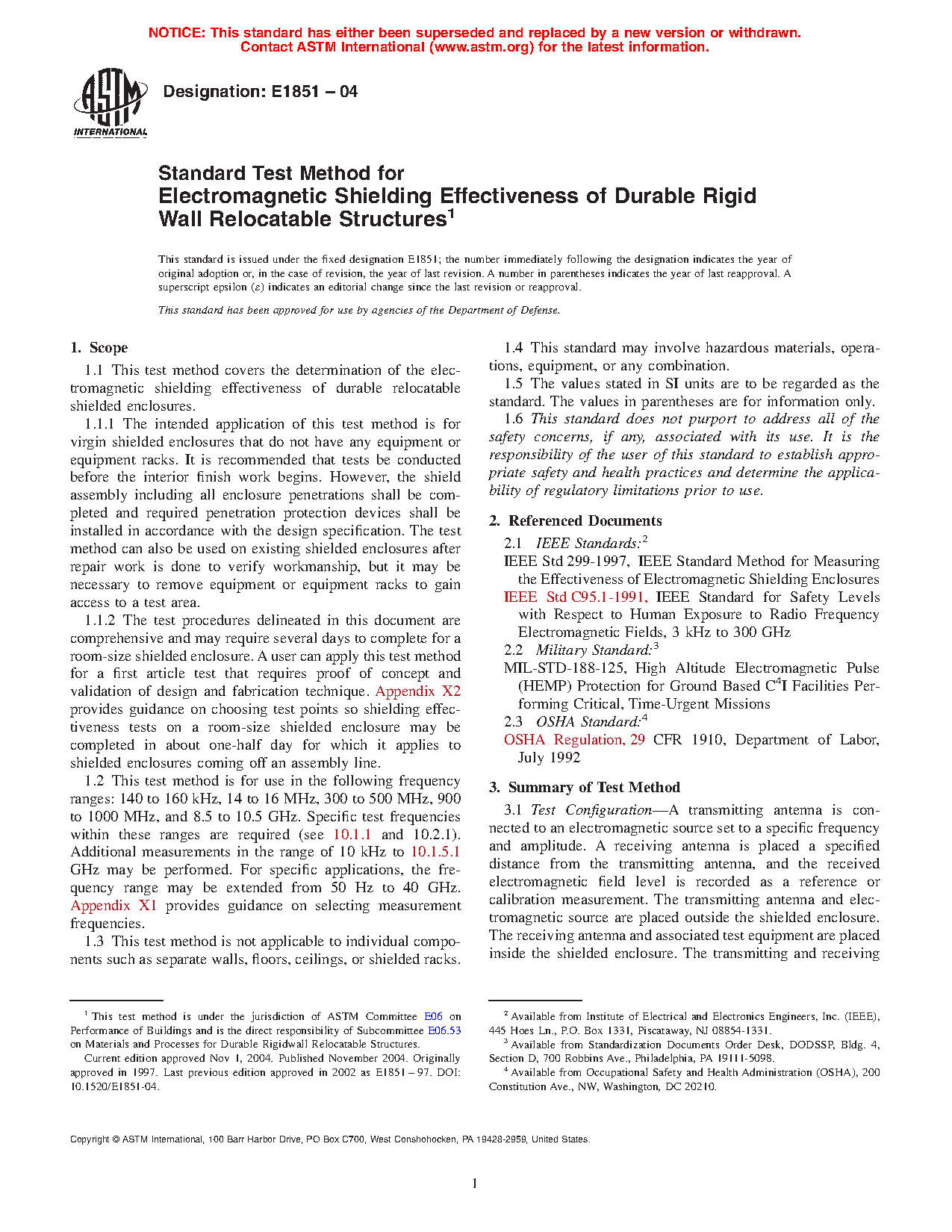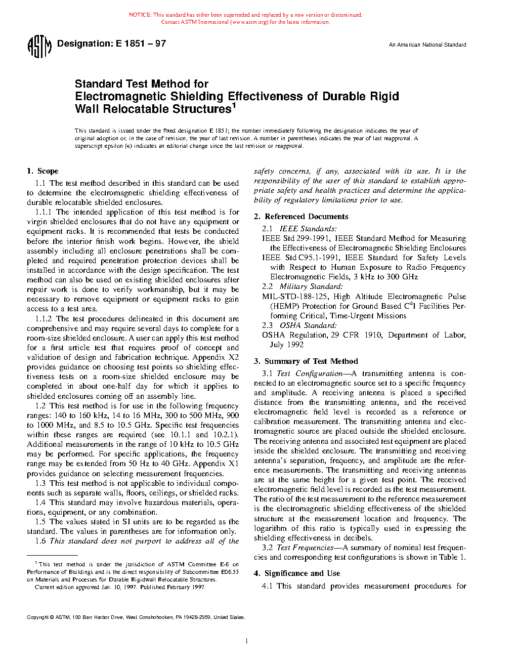 1.1 The test method described in this standard can be used to determine the electromagnetic shielding effectiveness of durable relocatable shielded enclosures.