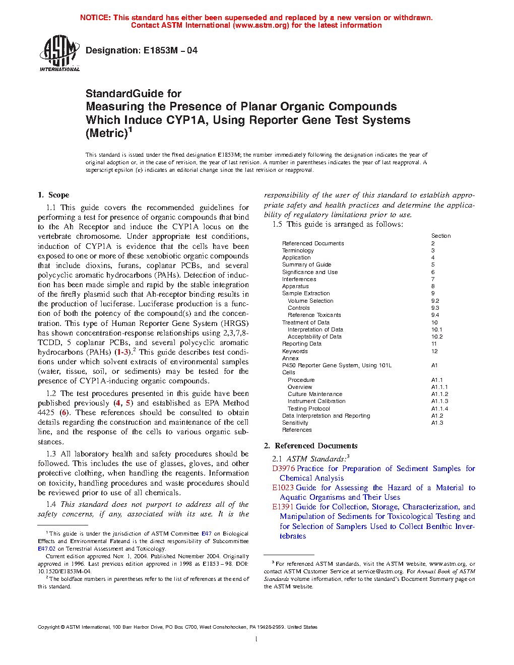 1.1 This guide covers the recommended guidelines for performing a test for presence of organic compounds that bind to the Ah Receptor and induce the CYP1A locus on the vertebrate chromosome. Under appropriate test conditions, induction of CYP1A is evidence that the cells have been exposed to one or more of these xenobiotic organic compounds that include dioxins, furans, coplanar PCBs, and several polycyclic aromatic hydrocarbons (PAHs). Detection of induction has been made simple and rapid by the stable integration of the firefly plasmid such that Ah-receptor binding results in the production of luciferase. Luciferase production is a function of both the potency of the compound(s) and the concentration. This type of Human Reporter Gene System (HRGS) has shown concentration-response relationships using 2,3,7,8-TCDD, 5 coplanar PCBs, and several polycyclic aromatic hydrocarbons (PAHs) (1-3). This guide describes test conditions under which solvent extracts of environmental samples (water, tissue, soil, or sediments) may be tested for the presence of CYP1A-inducing organic compounds.