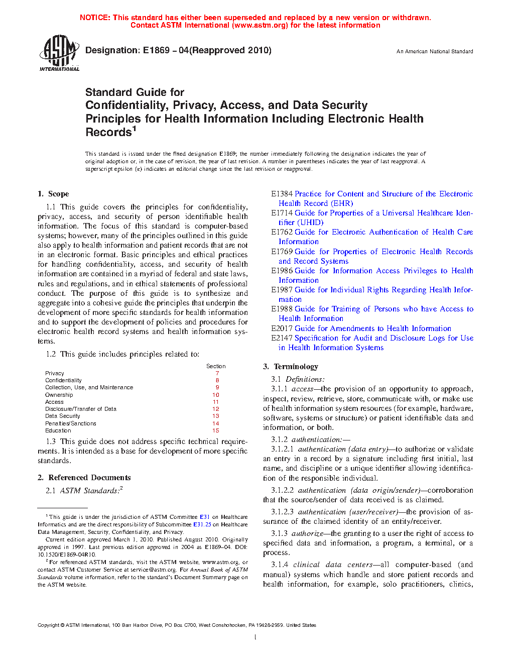 Standard Guide for Confidentiality, Privacy, Access, and Data Security Principles for Health Information Including Electronic Health Records