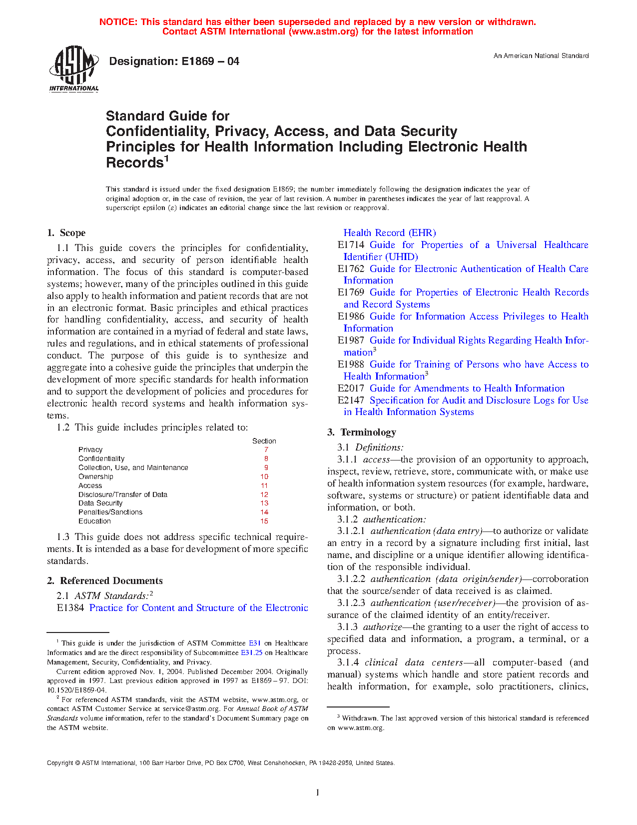 1.1 This guide covers the principles for confidentiality, privacy, access and security of person identifiable health information. The focus of this standard is computer-based systems, however, many of the principles outlined in this guide also apply to health information and patient records that are not in an electronic format. Basic principles and ethical practices for handling confidentiality, access, and security of health information are contained in a myriad of federal and state laws, rules and regulations, and in ethical statements of professional conduct. Although there are many sources for guidance, there is no current national standard guide on this topic.
