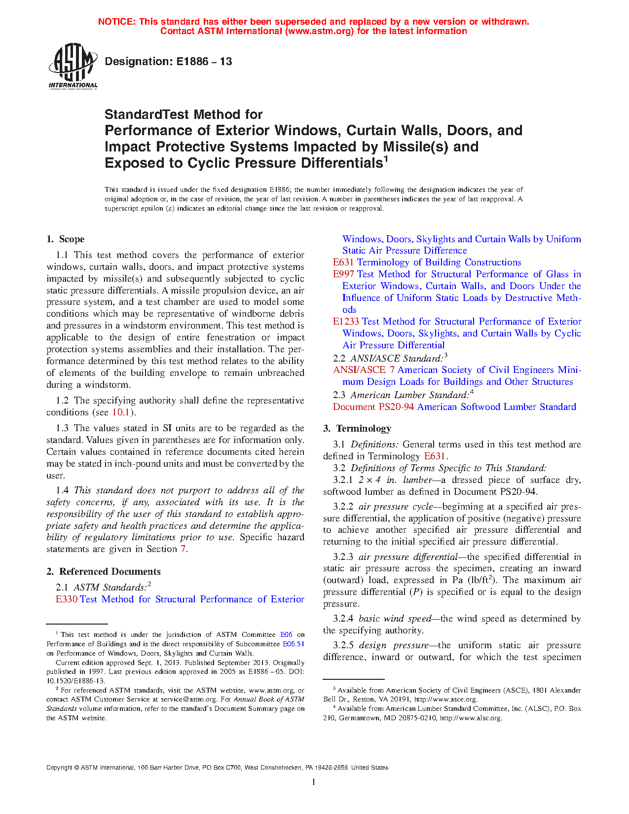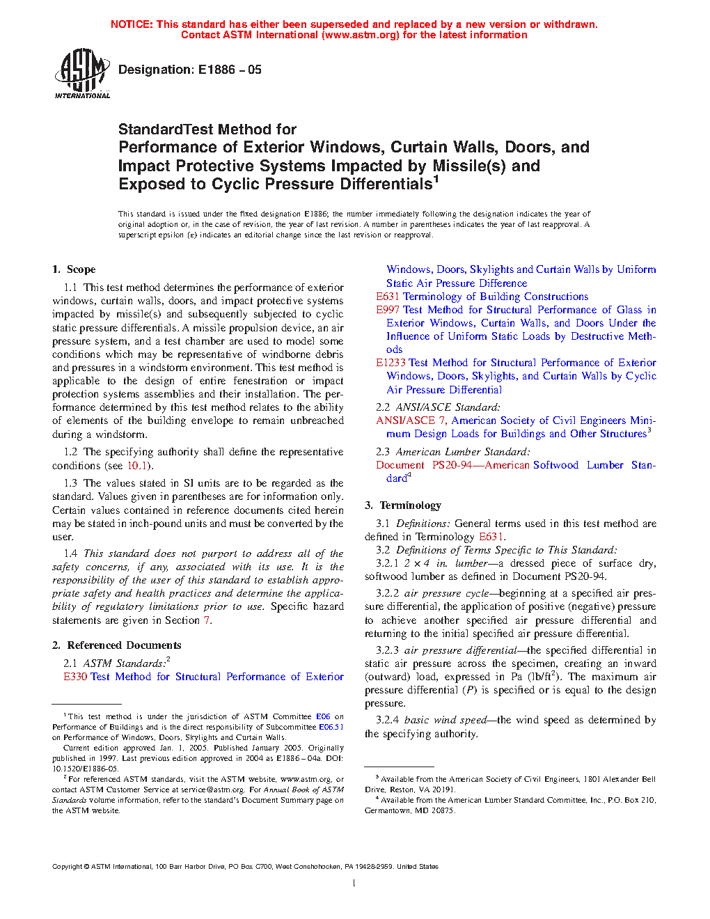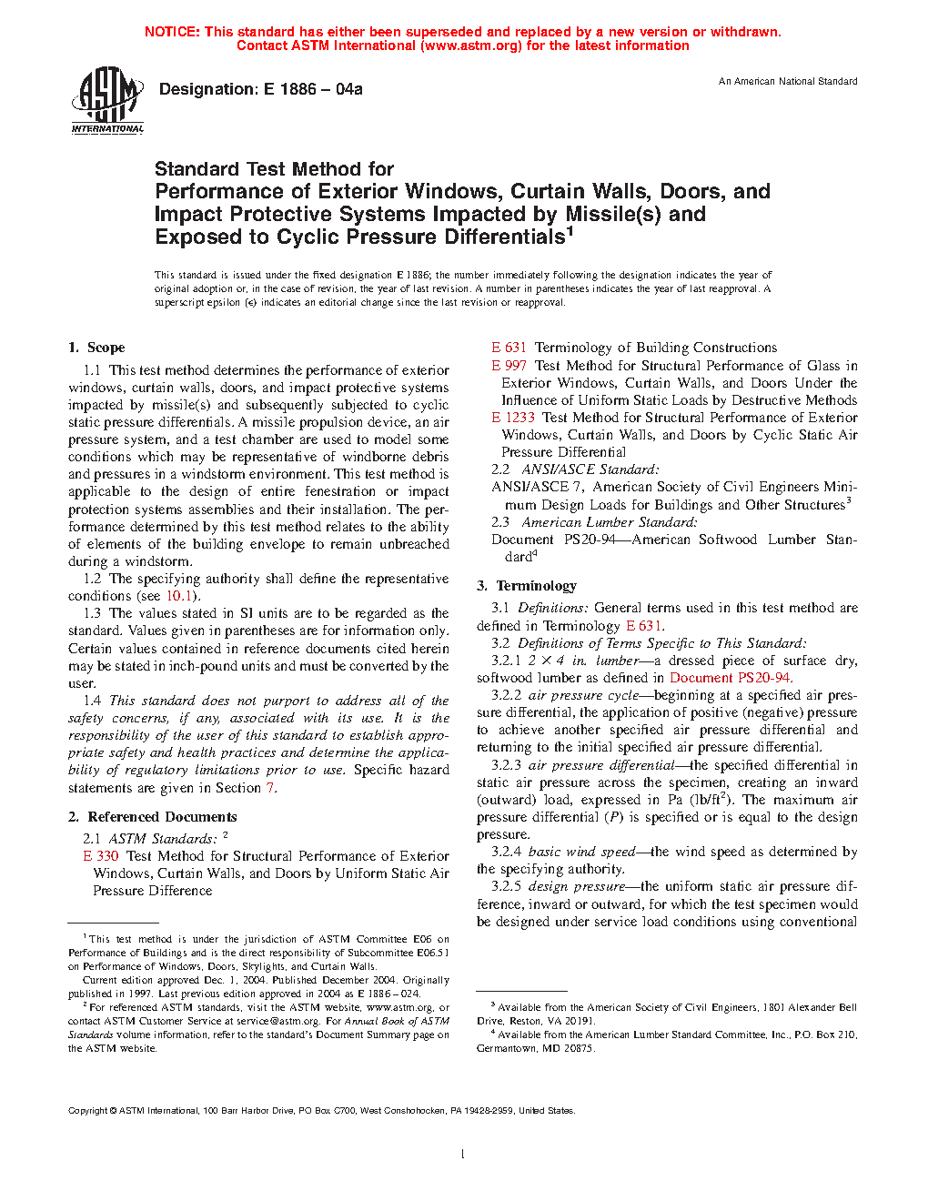 1.1 This test method determines the performance of exterior windows, curtain walls, doors, and storm shutters impacted by missile(s) and subsequently subjected to cyclic static pressure differentials. A missile propulsion device, an air pressure system, and a test chamber are used to model some conditions which may be representative of windborne debris and pressures in a windstorm environment. This test method is applicable to the design of entire fenestration or shutter assemblies and their installation. The performance determined by this test method relates to the ability of elements of the building envelope to remain unbreached during a windstorm.