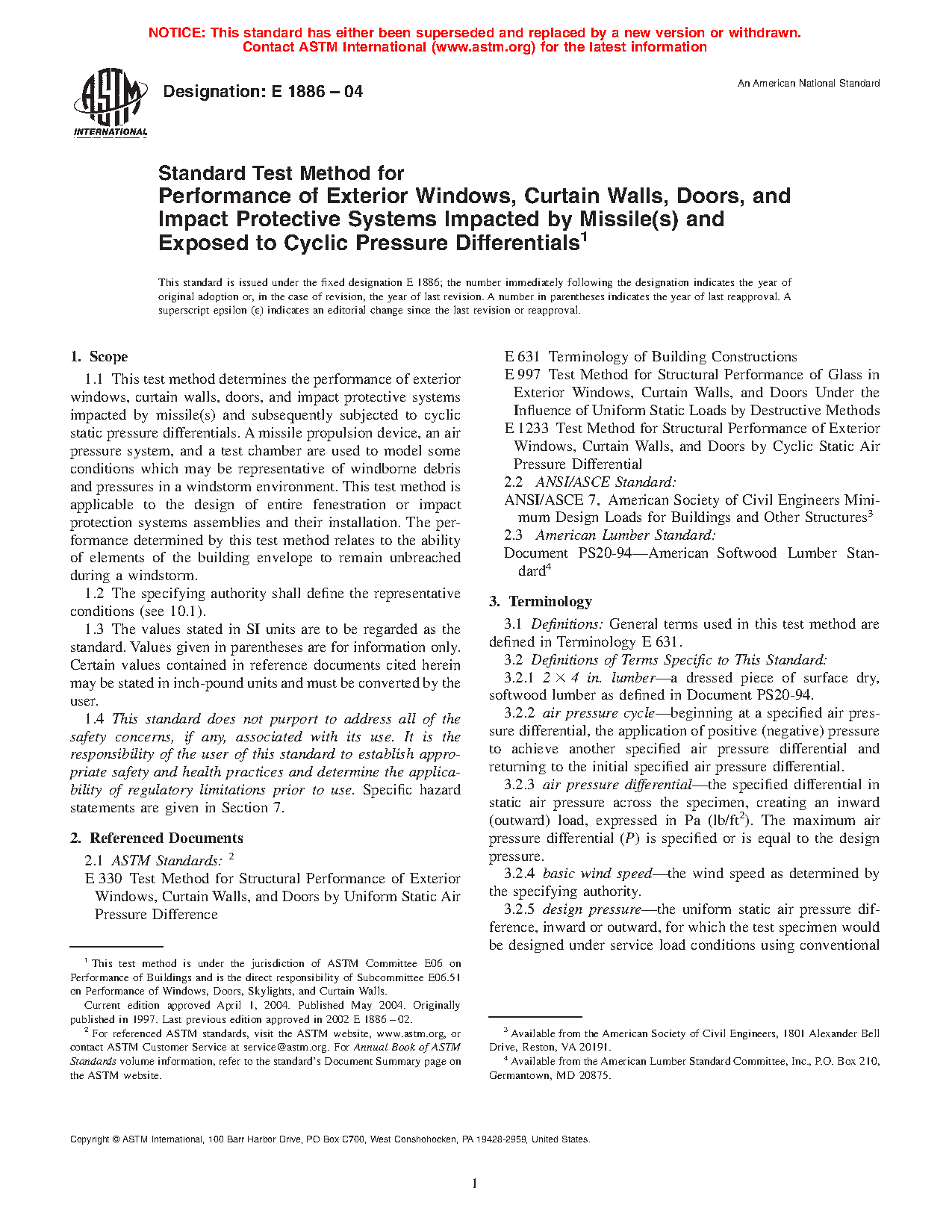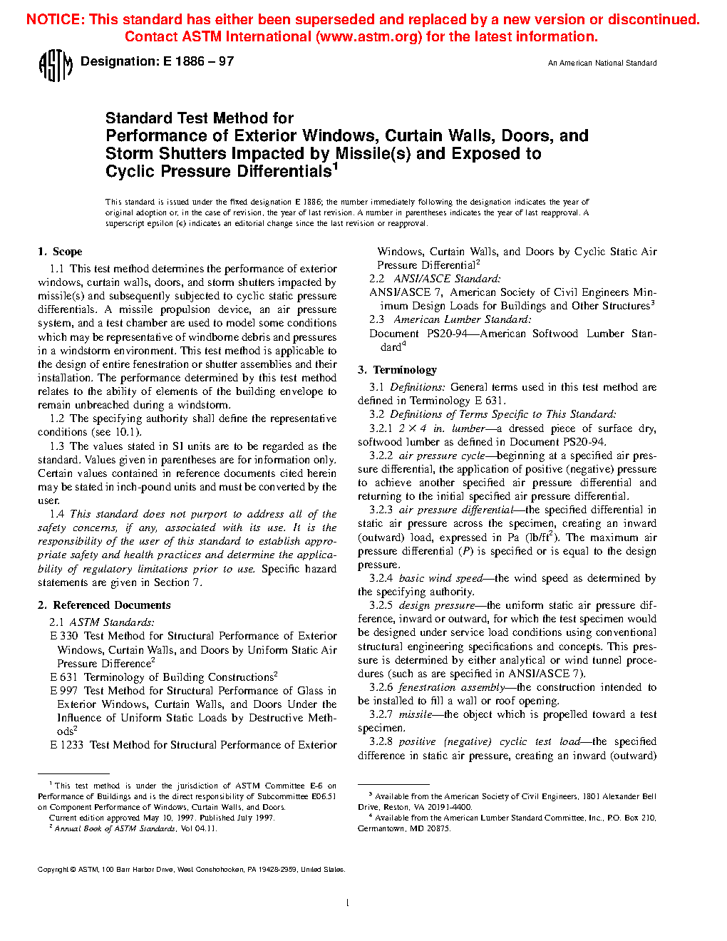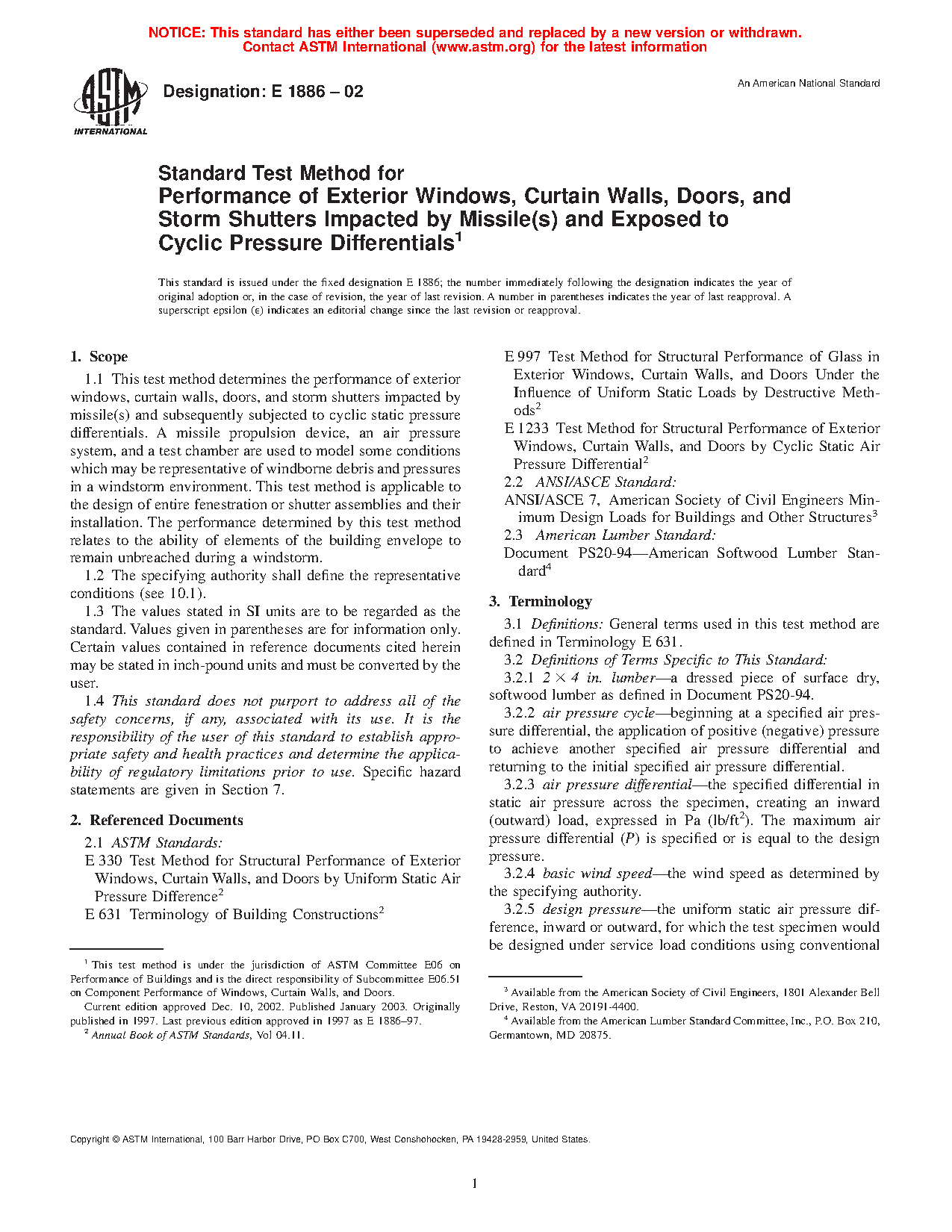 1.1 This test method determines the performance of exterior windows, curtain walls, doors, and storm shutters impacted by missile(s) and subsequently subjected to cyclic static pressure differentials. A missile propulsion device, an air pressure system, and a test chamber are used to model some conditions which may be representative of windborne debris and pressures in a windstorm environment. This test method is applicable to the design of entire fenestration or shutter assemblies and their installation. The performance determined by this test method relates to the ability of elements of the building envelope to remain unbreached during a windstorm.
