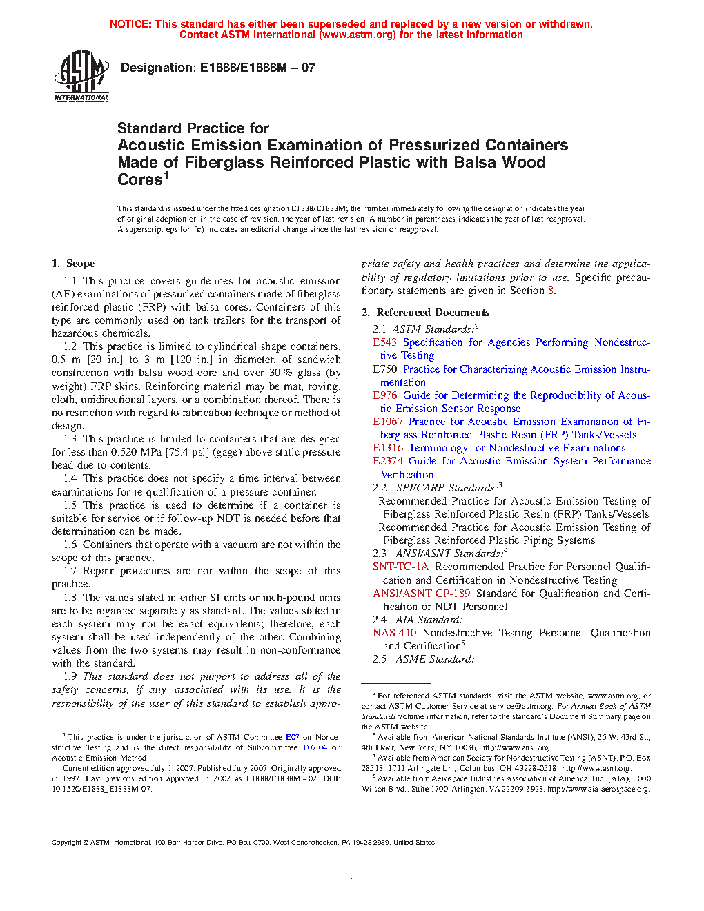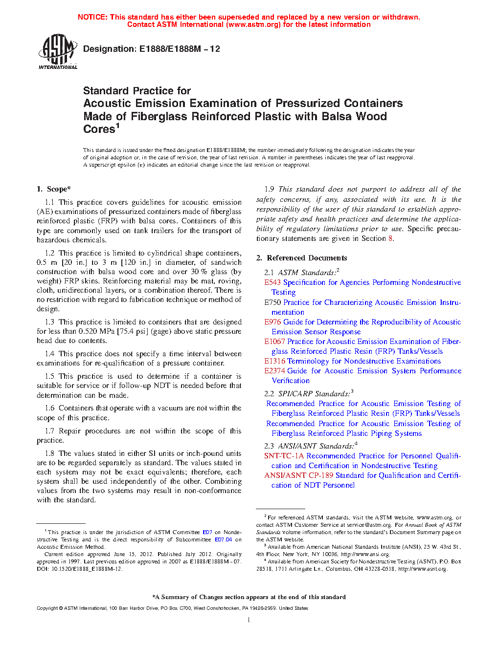 1.2 This practice is limited to cylindrical shape containers, 0.5 m [20 in.] to 3 m [120 in.] in diameter, of sandwich construction with balsa wood core and over 30 % glass (by weight) FRP skins. Reinforcing material may be mat, roving, cloth, unidirectional layers, or a combination thereof. There is no restriction with regard to fabrication technique or method of design.