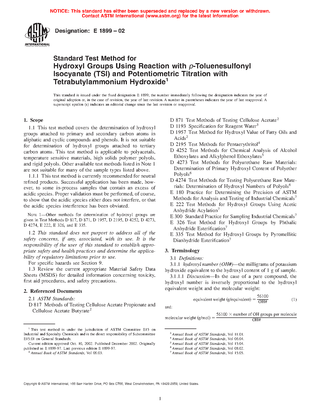 Hydroxyl is an important functional group and knowledge of its content is required in many intermediate and end use applications. This test method is for the determination of primary and secondary hydroxyl groups and can be used for the assay of compounds containing them.