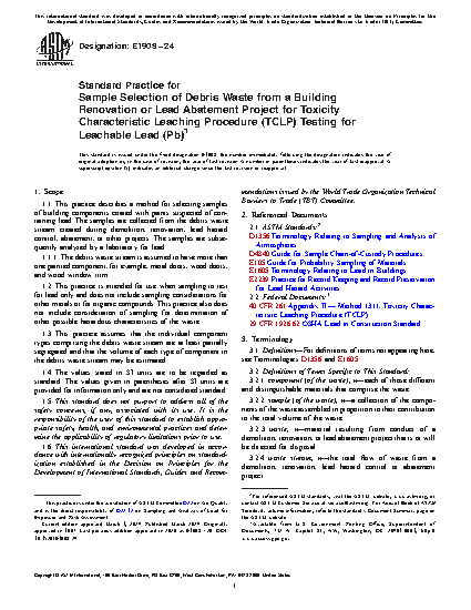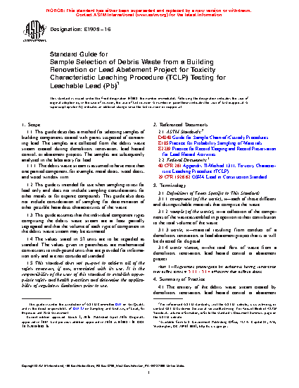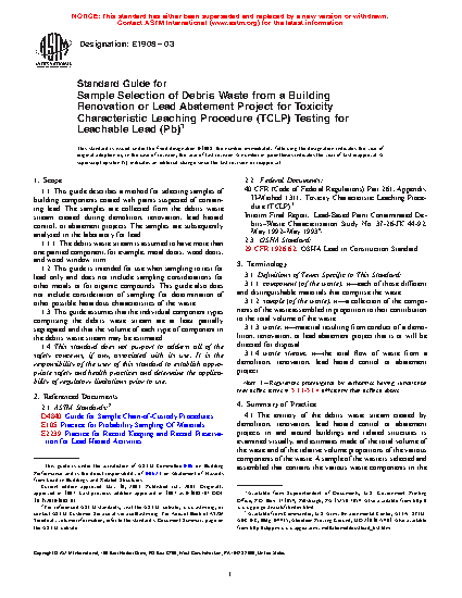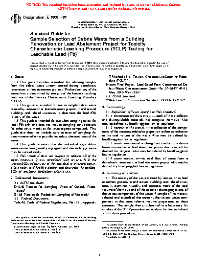 1.1 This guide describes a method for selecting samples from the debris waste stream created during demolition, renovation, or lead abatement projects. The lead toxicity of the waste then is determined by analysis of the leachate resulting from use of the Toxicity Characteristic Leaching Procedure (TCLP).