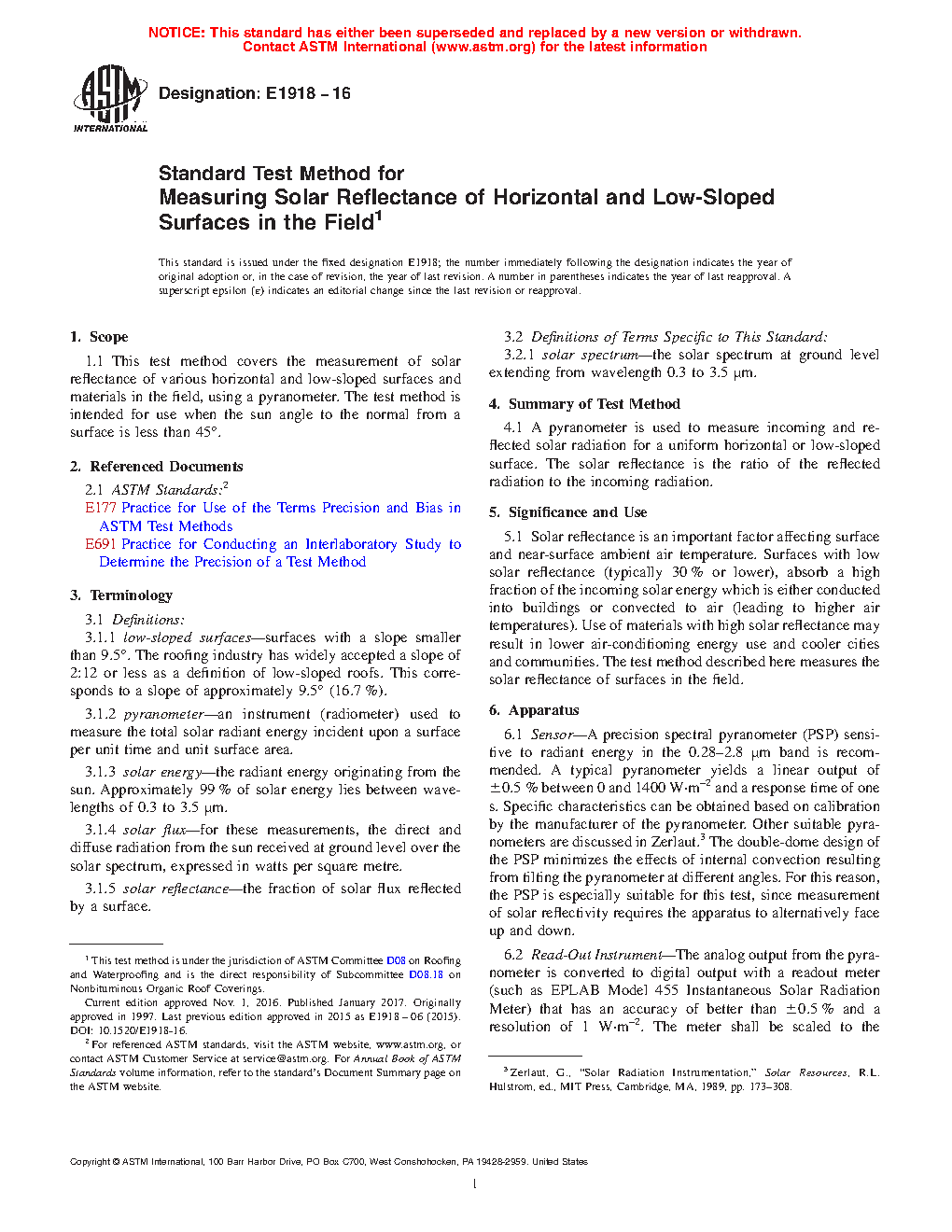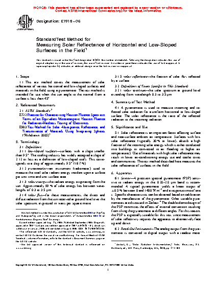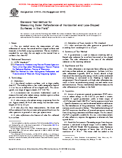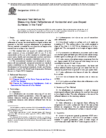 1.1 This test method covers the measurement of solar reflectance of various horizontal and low-sloped surfaces and materials in the field, using a pyranometer. The test method is intended for use when the sun angle to the normal from a surface is less than 45°.