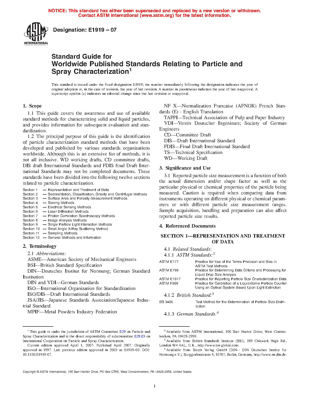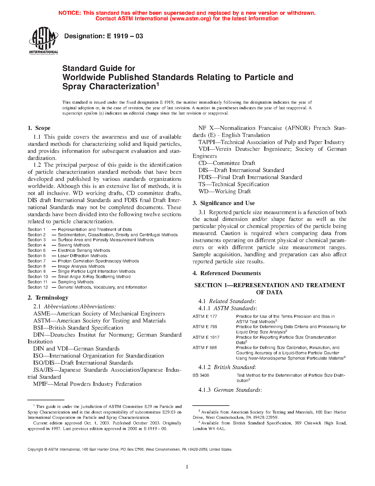 1.2 The principal purpose of this guide is the identification of particle characterization standard methods that have been developed and published by various standards organizations worldwide. Although this is an extensive list of methods, it is not all inclusive. WD working drafts, CD committee drafts, DIS draft International Standards and FDIS final Draft International Standards may not be completed documents. These standards have been divided into the following twelve sections related to particle characterization.