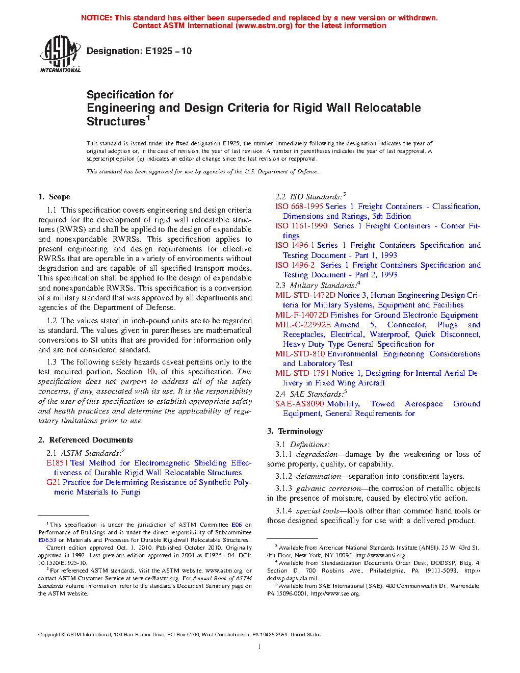 1.1 This specification covers engineering and design criteria required for the development of rigid wall relocatable structures (RWRS) and shall be applied to the design of expandable and nonexpandable RWRSs. This specification applies to present engineering and design requirements for effective RWRSs that are operable in a variety of environments without degradation and are capable of all specified transport modes. This specification shall be applied to the design of expandable and nonexpandable RWRSs. This specification is a conversion of a military standard that was approved by all departments and agencies of the Department of Defense.