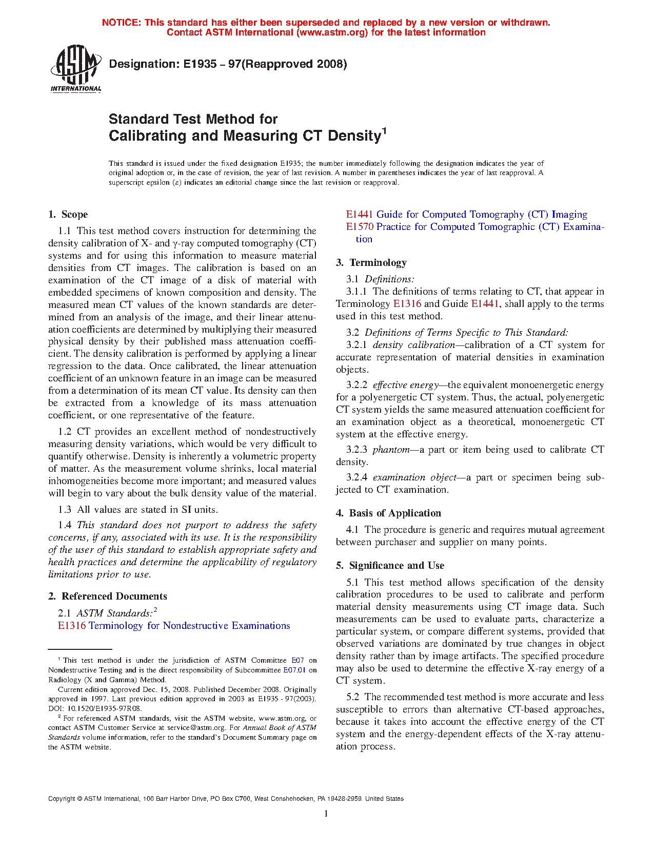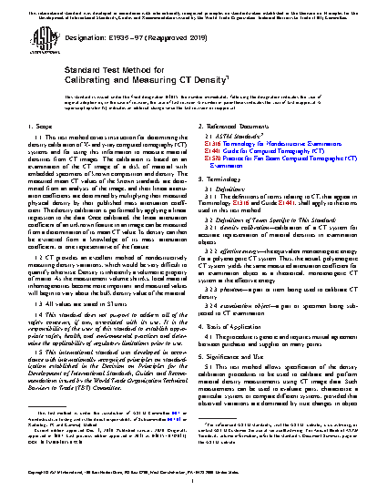 1.1 This test method covers instruction for determining the density calibration of X and y-ray computed tomography (CT) systems and for using this information to measure material densities from CT images. The calibration is based on an examination of the CT images of a disk of material with embedded specimens of know composition and density. The measured mean CT values of the known standards are determined from an analysis of the image, and their linear attenuation coefficients are determined by multiplying their measured physical density by their published mass attenuation coefficient. The density calibration is performed by applying a linear regression to the data. Once calibrated, the linear attenuation coefficient of an unknown feature in an image can be measured from a determination of its mean CT value. Its density can then be extracted from a knowledge of its mass attenuation coefficient, or one representative of the feature.