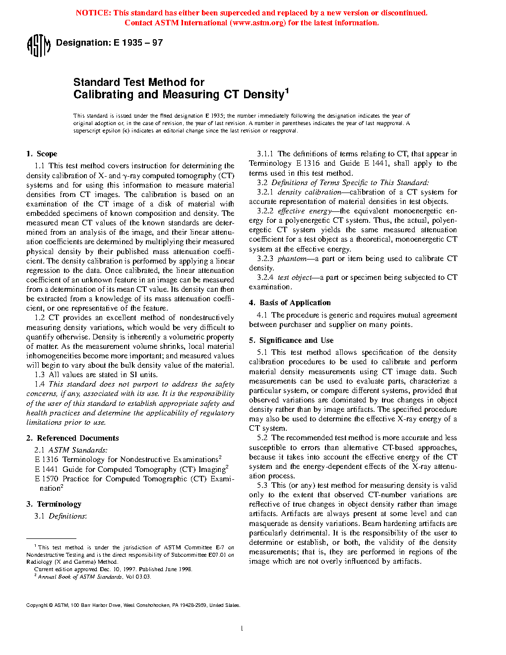 1.2 CT provides an excellent method of nondestructively measuring density variations, which would be very difficult to quantify otherwise. Density is inherently a volumetric property of matter. As the measurement volume shrinks, local material inhomogeneities become more important; and measured values will begin to vary about the bulk density value of the material.