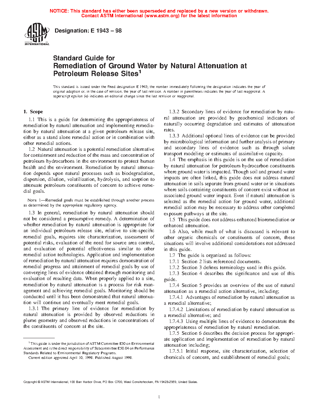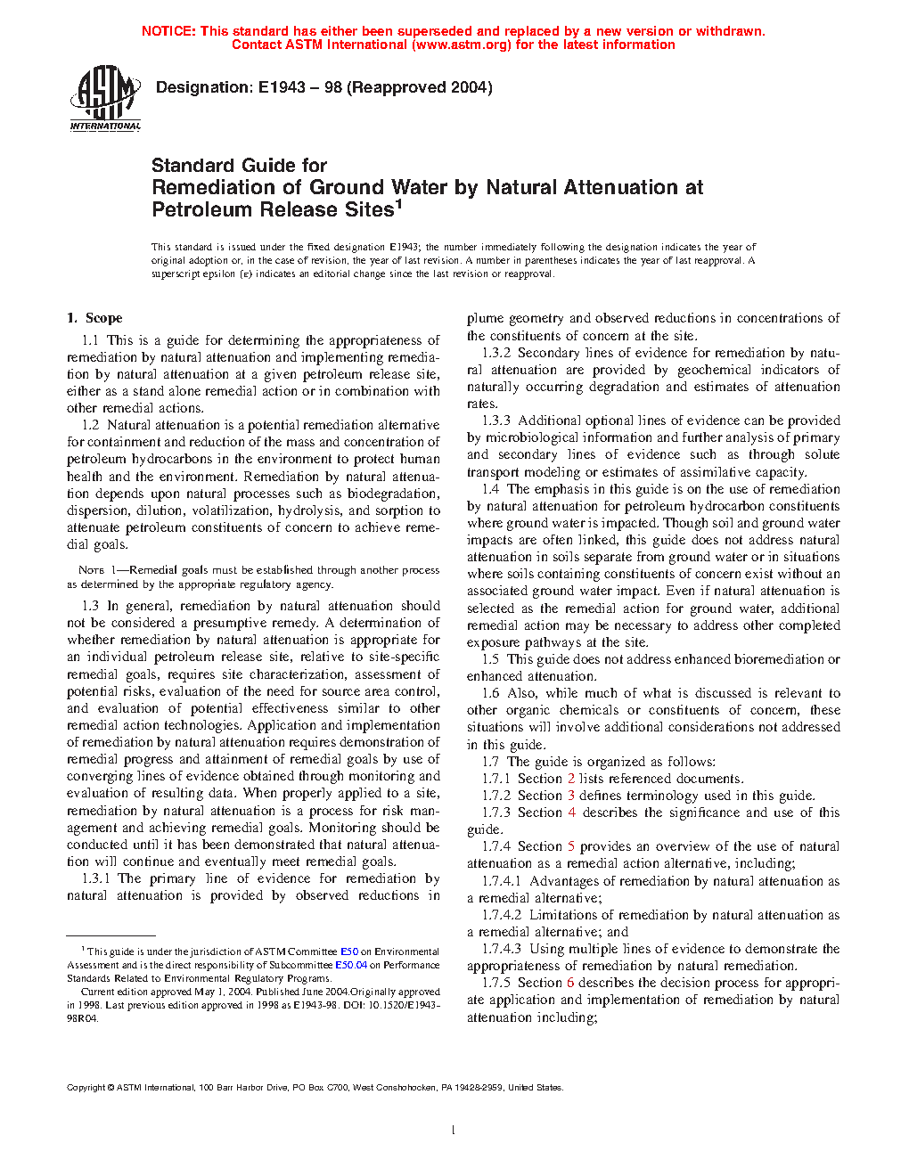 1.1 This is a guide for determining the appropriateness of remediation by natural attenuation and implementing remediation by natural attenuation at a given petroleum release site, either as a stand alone remedial action or in combination with other remedial actions.