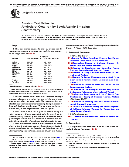 1.1 This test method covers the analysis of cast iron by spark atomic emission spectrometry for the following elements in the ranges shown (Note 1):