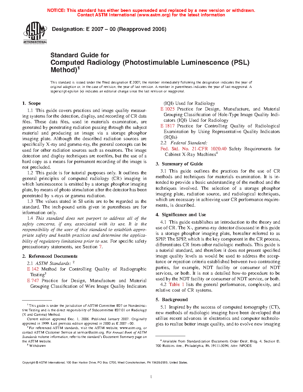 Materials presented within this guide may be useful in the development of end-user training programs designed by qualified CR personnel or activities that perform similar functions. Computed radiography is considered a rapidly advancing inspection technology that will require the user maintain knowledge of the latest CR apparatus and technique innovations. The REFERENCES section of this guide contains technical reference materials that may be useful in further advancement of knowledge associated with computed radiography.