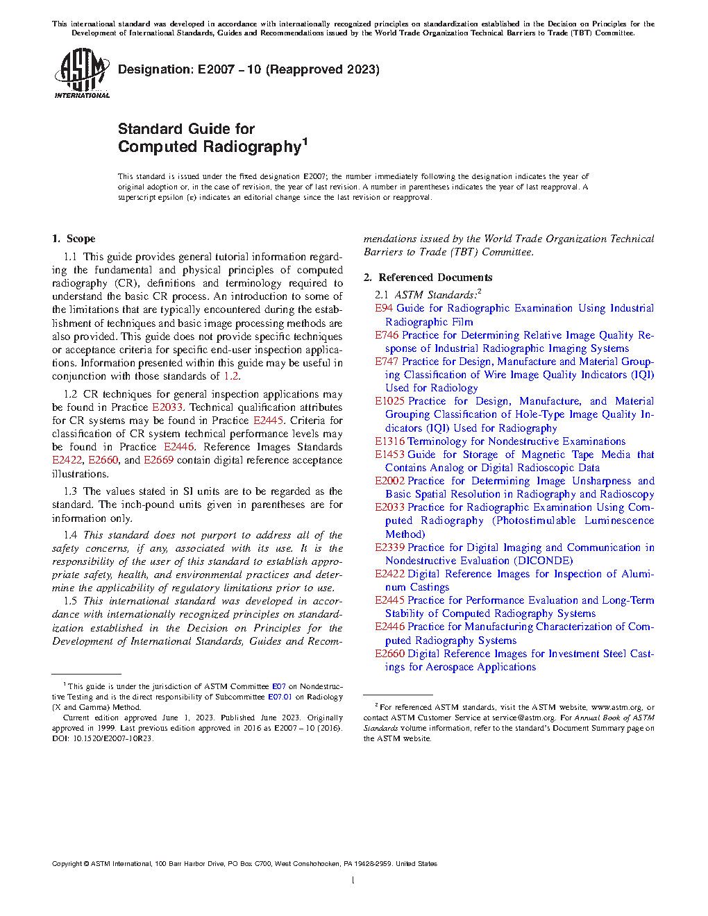 This guide is intended as a source of tutorial and reference information that can be used during establishment of computed radiography techniques and procedures by qualified CR personnel for specific applications. All materials presented within this guide may not be suited for all levels of computed radiographic personnel.