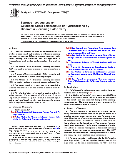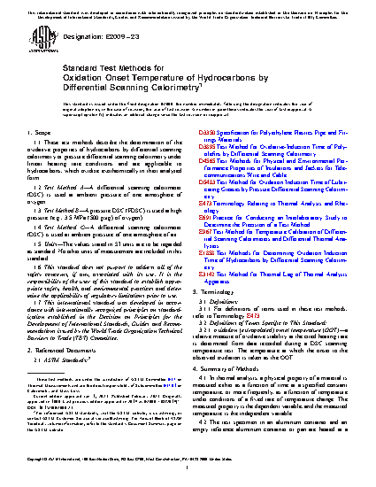 1.1 These test methods describe the determination of the oxidative properties of hydrocarbons by differential scanning calorimetry or pressure differential scanning calorimetry under linear heating rate conditions and are applicable to hydrocarbons, which oxidize exothermically in their analyzed form.