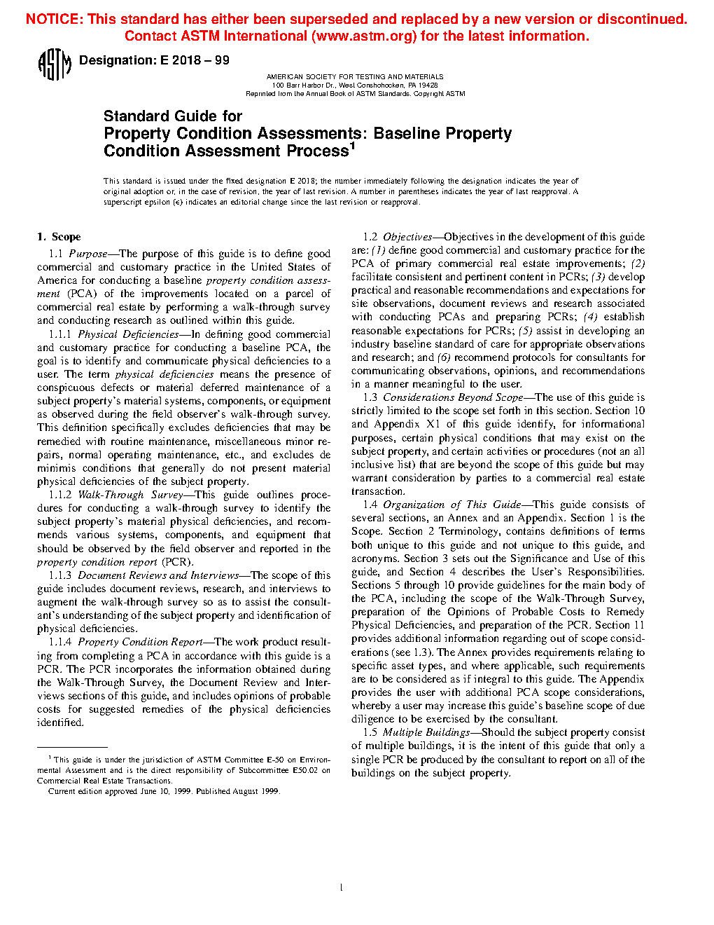 1.1 Purpose—The purpose of this guide is to provide a framework for conducting a property condition assessment (PCA) of the primary improvements at commercial real estate properties by performing a walk-through survey and conducting research as outlined within this guide.