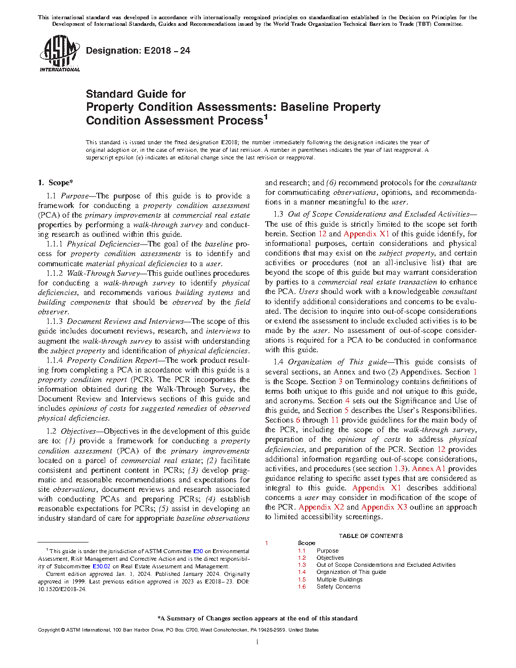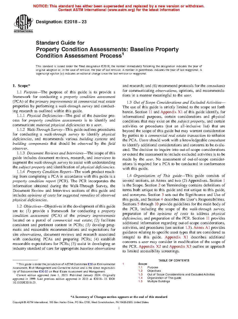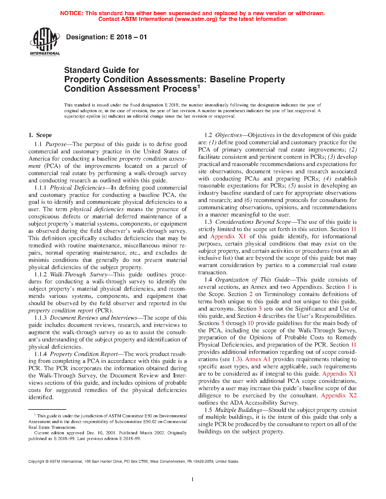 1.4 Organization of This guide—This guide consists of several sections, an Annex and two (2) Appendixes. Section 1 is the Scope. Section 2 on Terminology contains definitions of terms both unique to this guide and not unique to this guide, and acronyms. Section 3 sets out the Significance and Use of this guide, and Section 4 describes the User's Responsibilities. Sections 5 through 10 provide guidelines for the main body of the PCR, including the scope of the walk-through survey, preparation of the opinions of costs to address physical deficiencies, and preparation of the PCR. Section 11 provides additional information regarding out-of-scope considerations, activities, and procedures (see section 1.3). Annex A1 provides guidance relating to specific asset types that are considered as integral to this guide. Appendix X1 describes additional concerns a user may consider in modification of the scope of the PCR. Appendix X2 and Appendix X3 outline an approach to limited accessibility screenings.