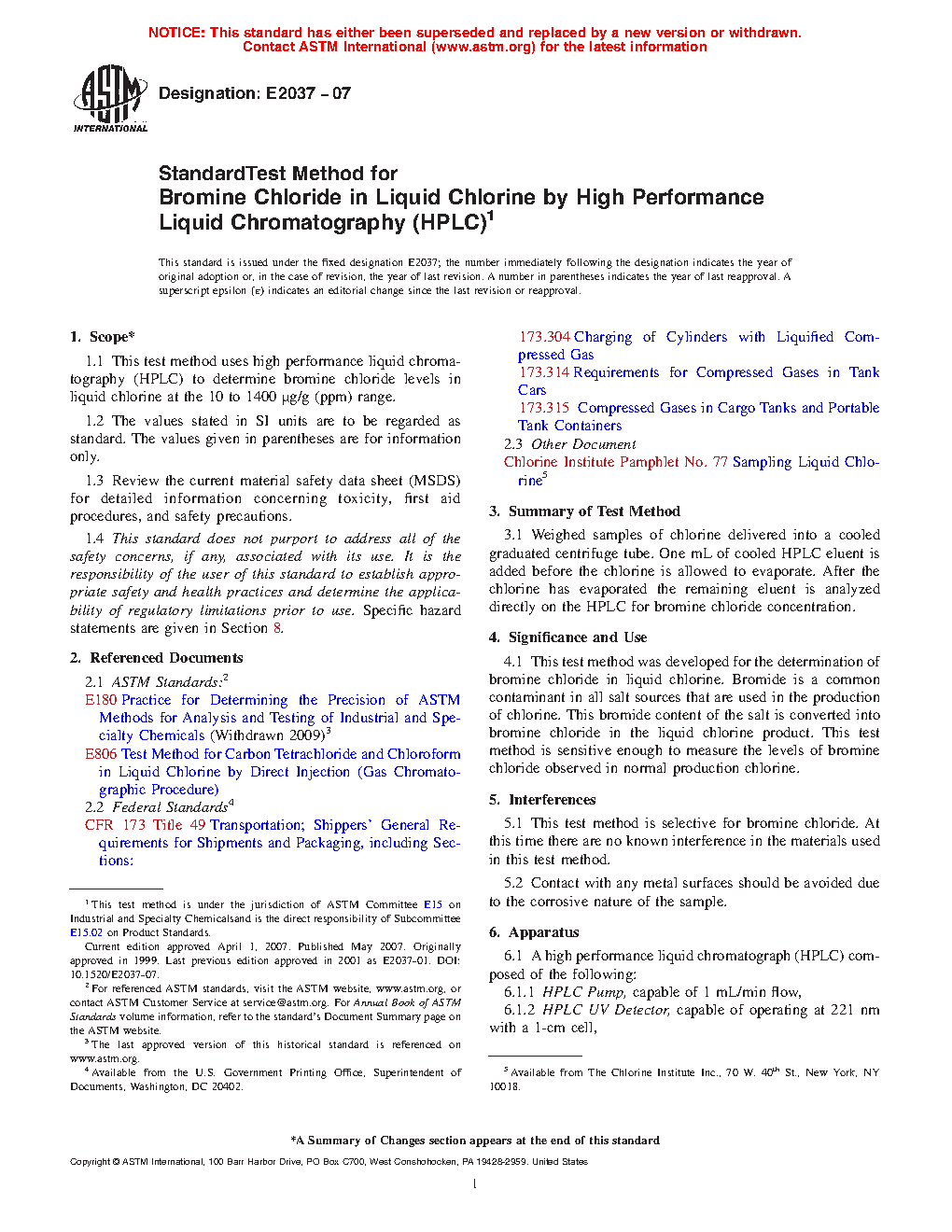 1.1 This test method uses high performance liquid chromatography (HPLC) to determine bromine chloride levels in liquid chlorine at the 10 to 1400 µg/g (ppm) range.
