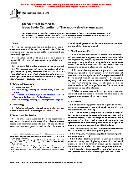 1.1 This test method describes the calibration or performance confirmation of the mass (or weight) scale of thermogravimetric analyzers and is applicable to commercial and custom-built apparatus.