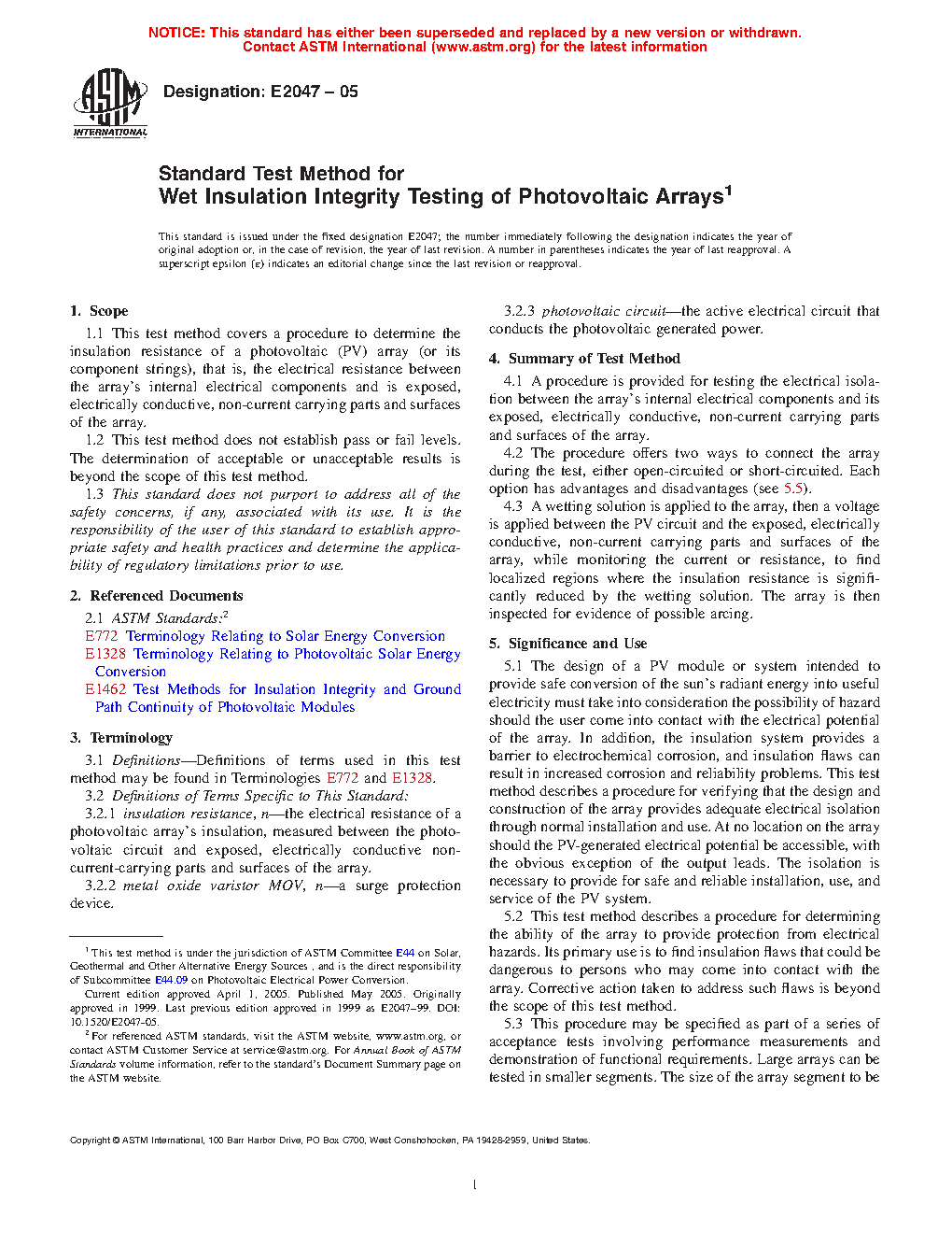 1.1 This test method covers a procedure to determine the insulation resistance of a photovoltaic (PV) array (or its component strings), that is, the electrical resistance between the array's internal electrical components and is exposed, electrically conductive, non-current carrying parts and surfaces of the array.