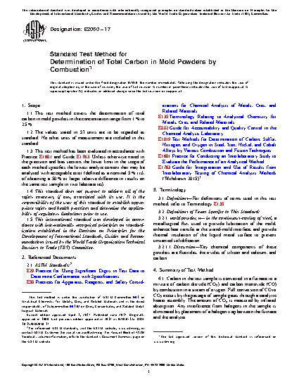 5.1 This test method for the determination of total carbon in mold powders is primarily intended to test such materials for compliance with compositional specifications. It is assumed that all who use this test method will be trained analysts capable of performing common laboratory procedures skillfully and safely. It is expected that the work will be performed in a properly equipped laboratory and that proper waste disposal procedures will be followed. Appropriate quality control practices must be followed such as those described in Guide E882.