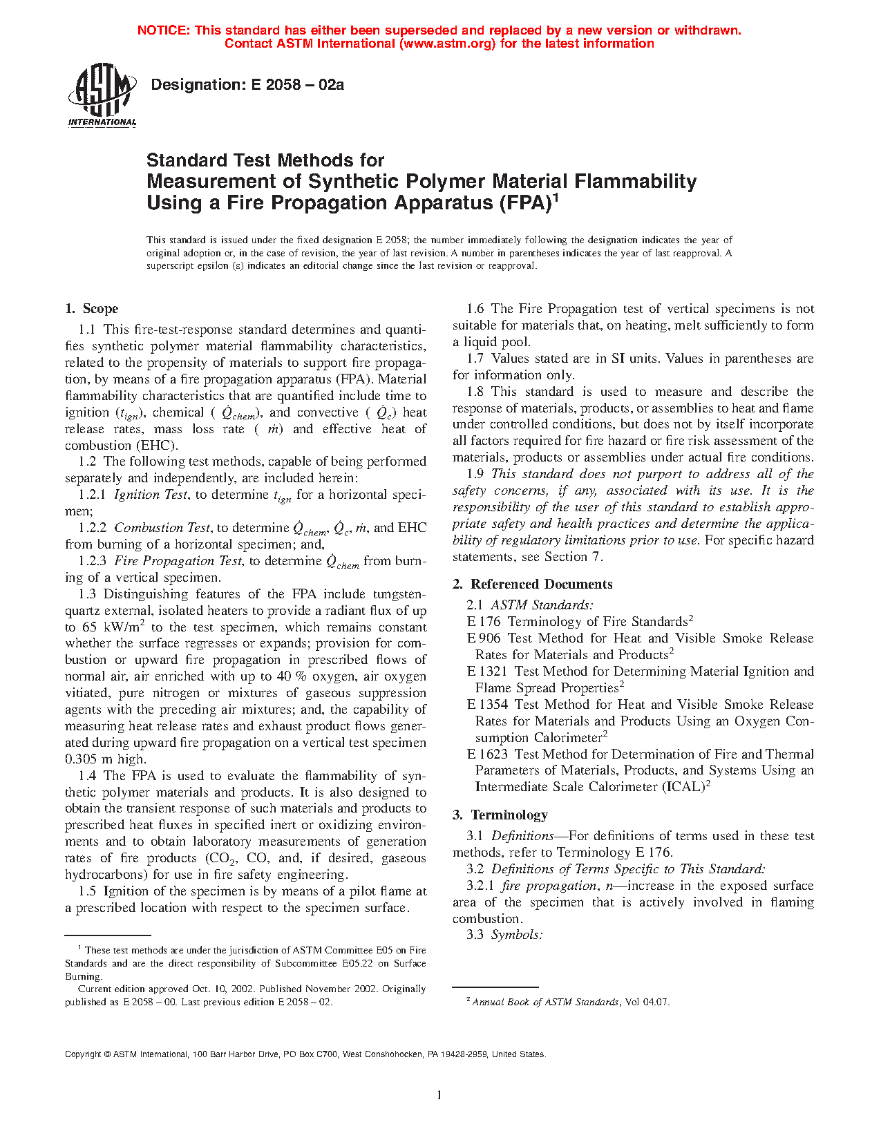 1.1 This fire-test-response standard determines and quantifies synthetic polymer material flammability characteristics, related to the propensity of materials to support fire propagation, by means of a fire propagation apparatus (FPA). Material flammability characteristics that are quantified include time to ignition (tign), chemical ( Q˙chem), and convective ( Q˙c) heat release rates, mass loss rate ( m˙) and effective heat of combustion (EHC).