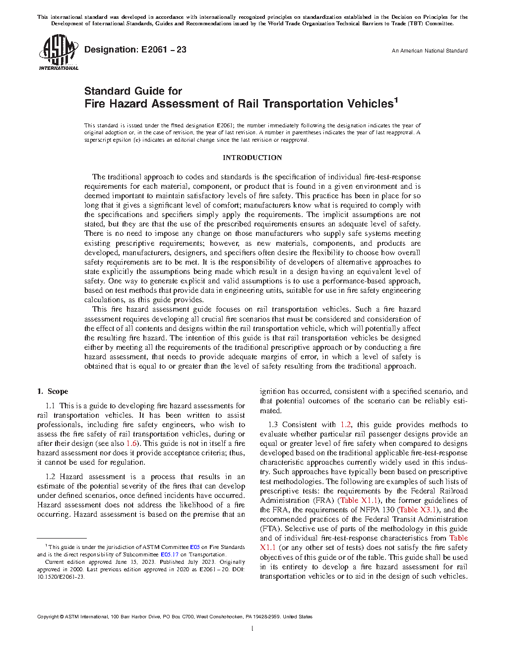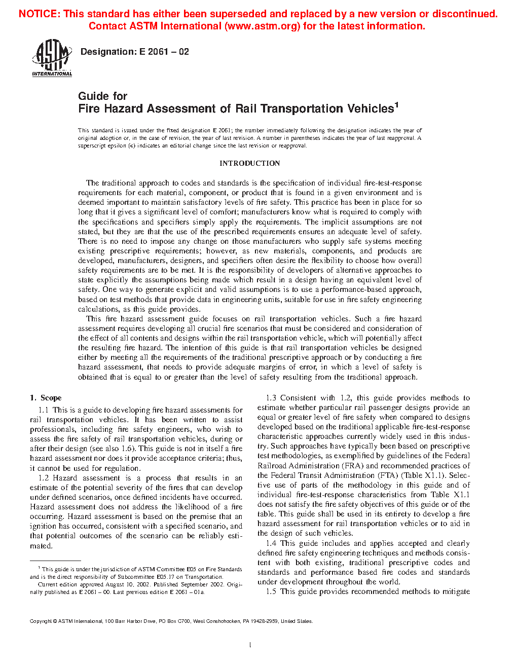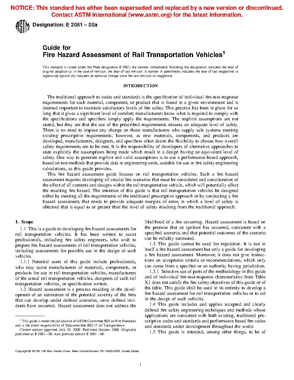 1.1 This is a guide to developing fire hazard assessments for rail transportation vehicles. It has been written to assist professionals, including fire safety engineers, who wish to assess the fire safety of rail transportation vehicles, during or after their design (see also 1.6). This guide is not in itself a fire hazard assessment nor does it provide acceptance criteria; thus, it cannot be used for regulation.