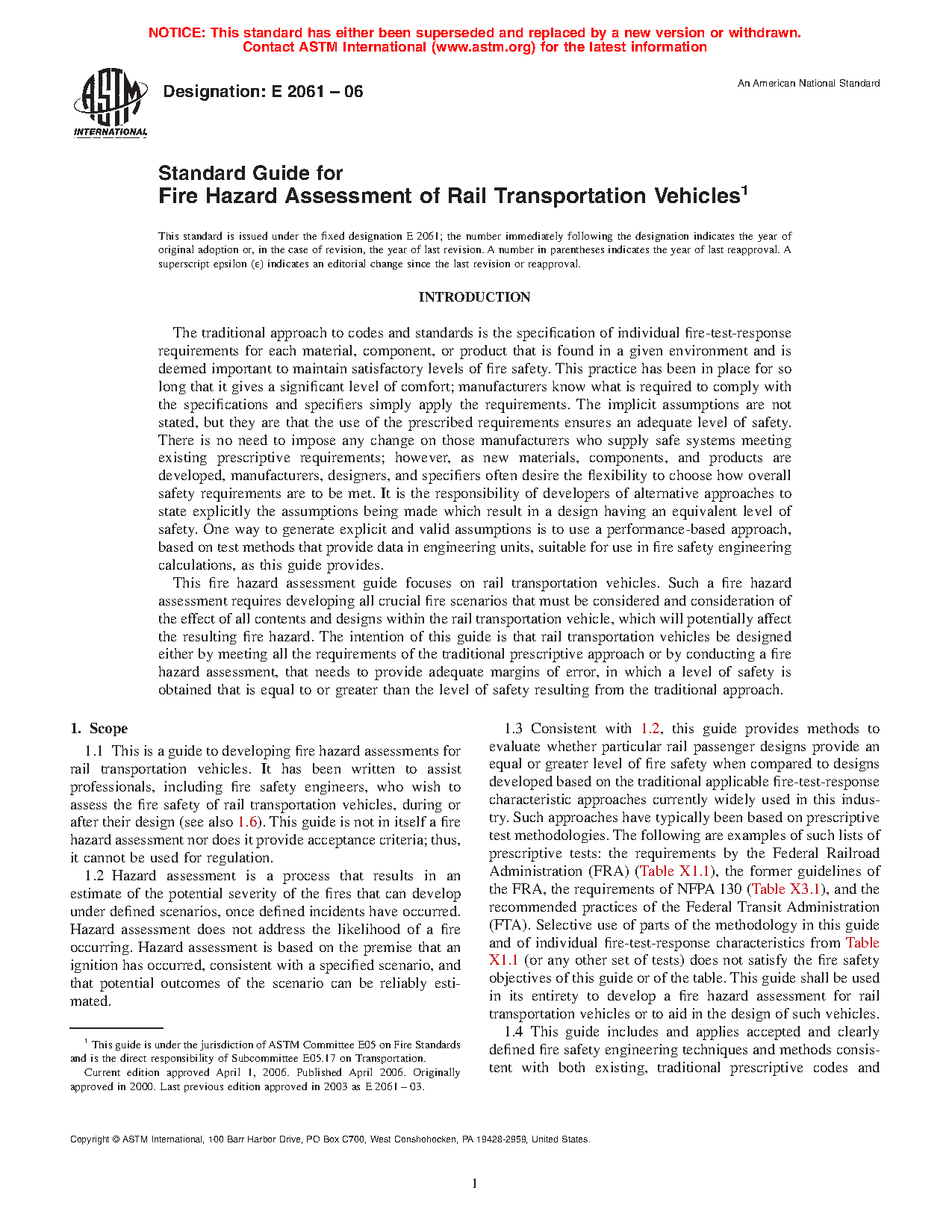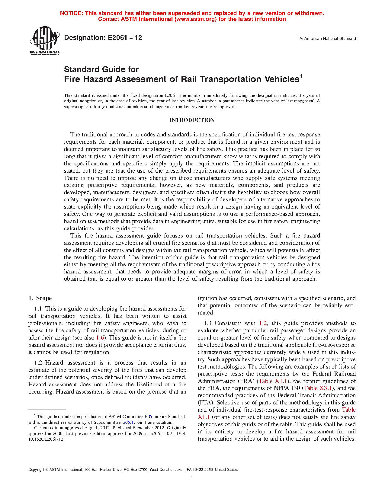 1.3 Consistent with 1.2, this guide provides methods to evaluate whether particular rail passenger designs provide an equal or greater level of fire safety when compared to designs developed based on the traditional applicable fire-test-response characteristic approaches currently widely used in this industry. Such approaches have typically been based on prescriptive test methodologies. The following are examples of such lists of prescriptive tests: the requirements by the Federal Railroad Administration (FRA) (Table X1.1), the former guidelines of the FRA, the requirements of NFPA 130 (Table X3.1), and the recommended practices of the Federal Transit Administration (FTA). Selective use of parts of the methodology in this guide and of individual fire-test-response characteristics from Table X1.1 (or any other set of tests) does not satisfy the fire safety objectives of this guide or of the table. This guide shall be used in its entirety to develop a fire hazard assessment for rail transportation vehicles or to aid in the design of such vehicles.
