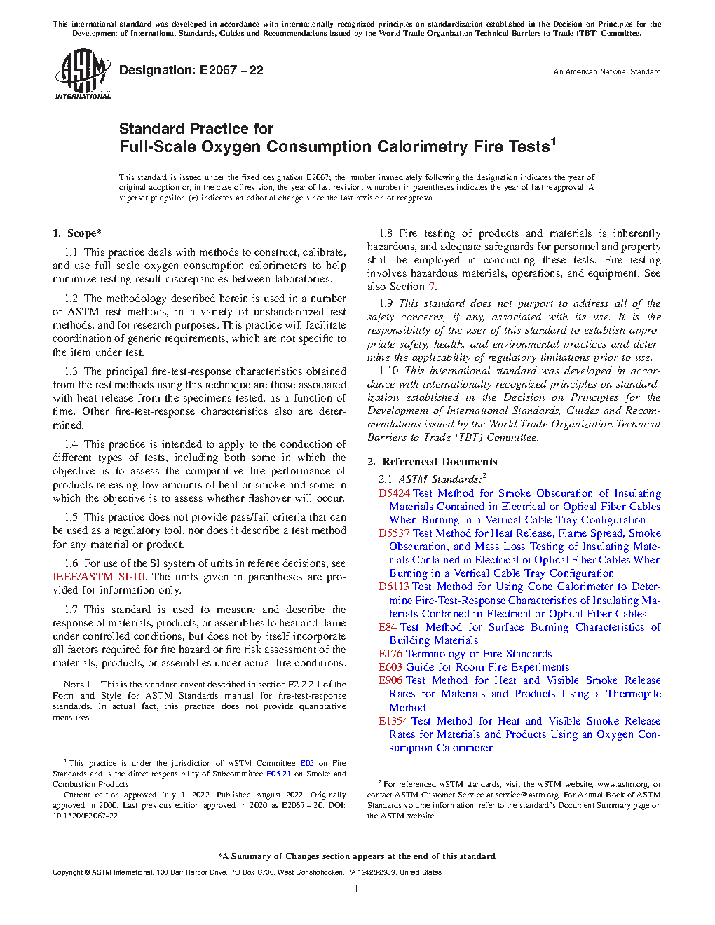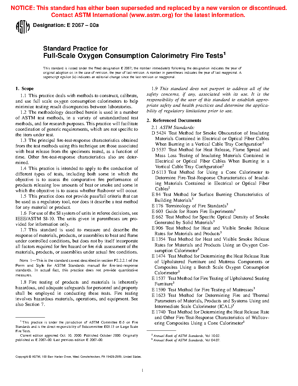 4.4.1 Small scale test methods using this technique, such as Test Methods D6113, E1354, E1474 and E1740, as well as ISO 5660-1 internationally, are based on a stand-alone apparatus, wherein a small specimen is tested within the equipment. A small-scale test using oxygen consumption calorimetry with a larger test specimen (than the above referenced test methods) and intended for low levels of heat release is Test Method E2965.
