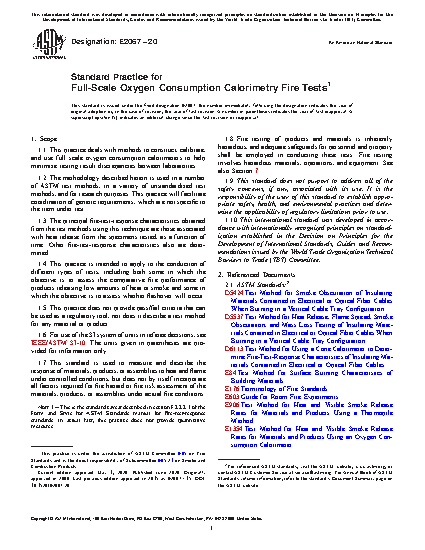 4.4 The oxygen consumption technique is used in different types of test methods. Intermediate scale (Test Method E1623, UL 1975) and full scale (Test Method D5424, Test Method D5537, Test Method E1537, Test Method E1590, Test Method E1822, ISO 9705-1, NFPA 265, NFPA 266, NFPA 267, NFPA 286, UL 1685) test methods, as well as unstandardized room scale experiments following Guide E603, using this technique involve a large instrumented exhaust hood, where oxygen concentration is measured, either standing alone or positioned outside a doorway. A large test specimen is placed either under the hood or inside the room. This practice is intended to address issues associated with equipment requiring a large instrumented hood and not stand-alone test apparatuses with small test specimens.