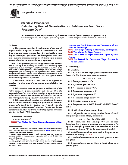 1.1 This practice describes the calculation of the heat of vaporization of a liquid or the heat of sublimation of a solid from measured vapor pressure data. It is applicable to pure liquids, azeotropes, pure solids, and homogenous solid solutions over the temperature range for which the vapor pressure equation fitted to the measured data is applicable.