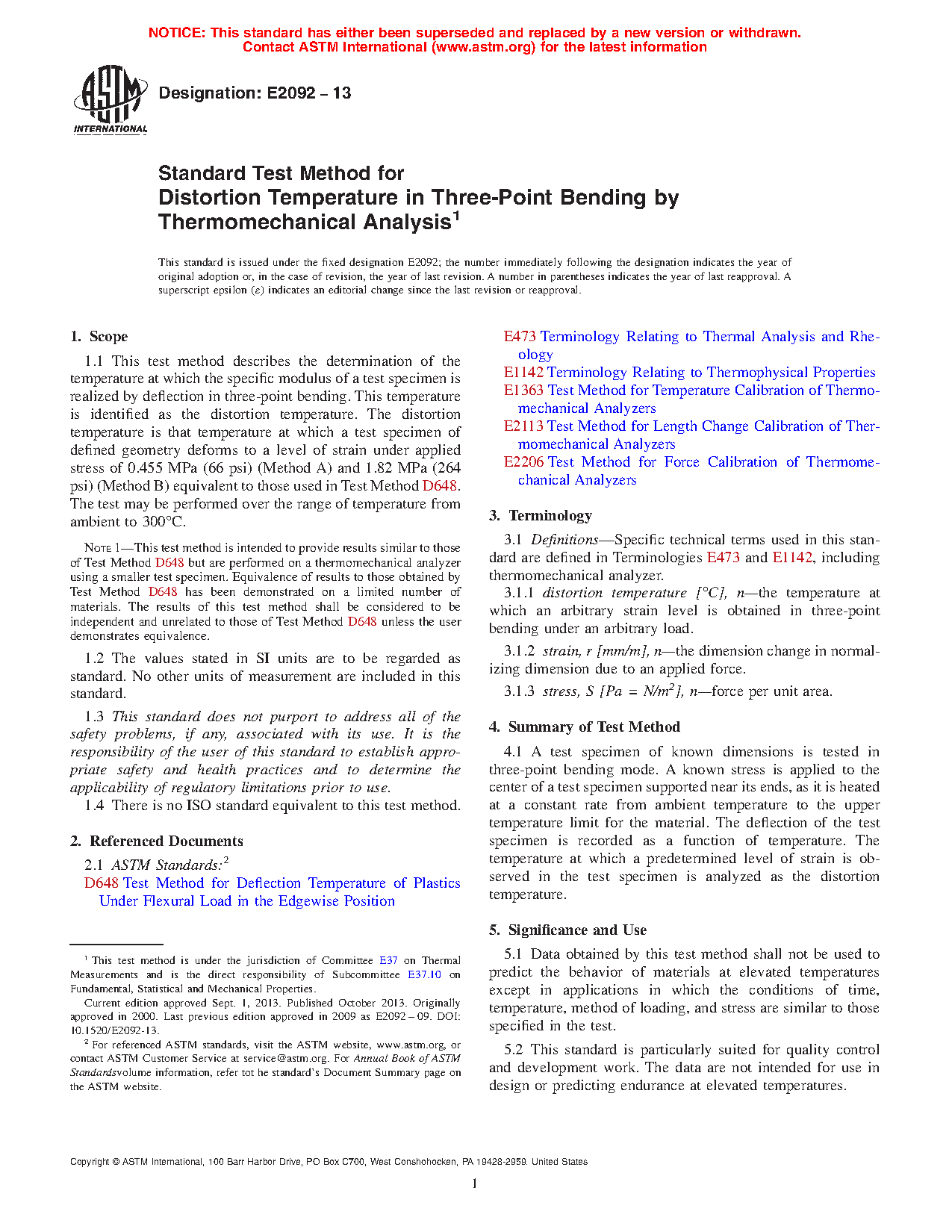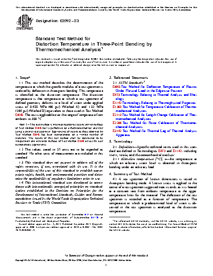 1.1 This test method describes the determination of the temperature at which the specific modulus of a test specimen is realized by deflection in three-point bending. This temperature is identified as the distortion temperature. The distortion temperature is that temperature at which a test specimen of defined geometry deforms to a level of strain under applied stress of 0.455 MPa (66 psi) (Method A) and 1.82 MPa (264 psi) (Method B) equivalent to those used in Test Method D648. The test is applicable over the range of temperature from ambient to 300 °C.