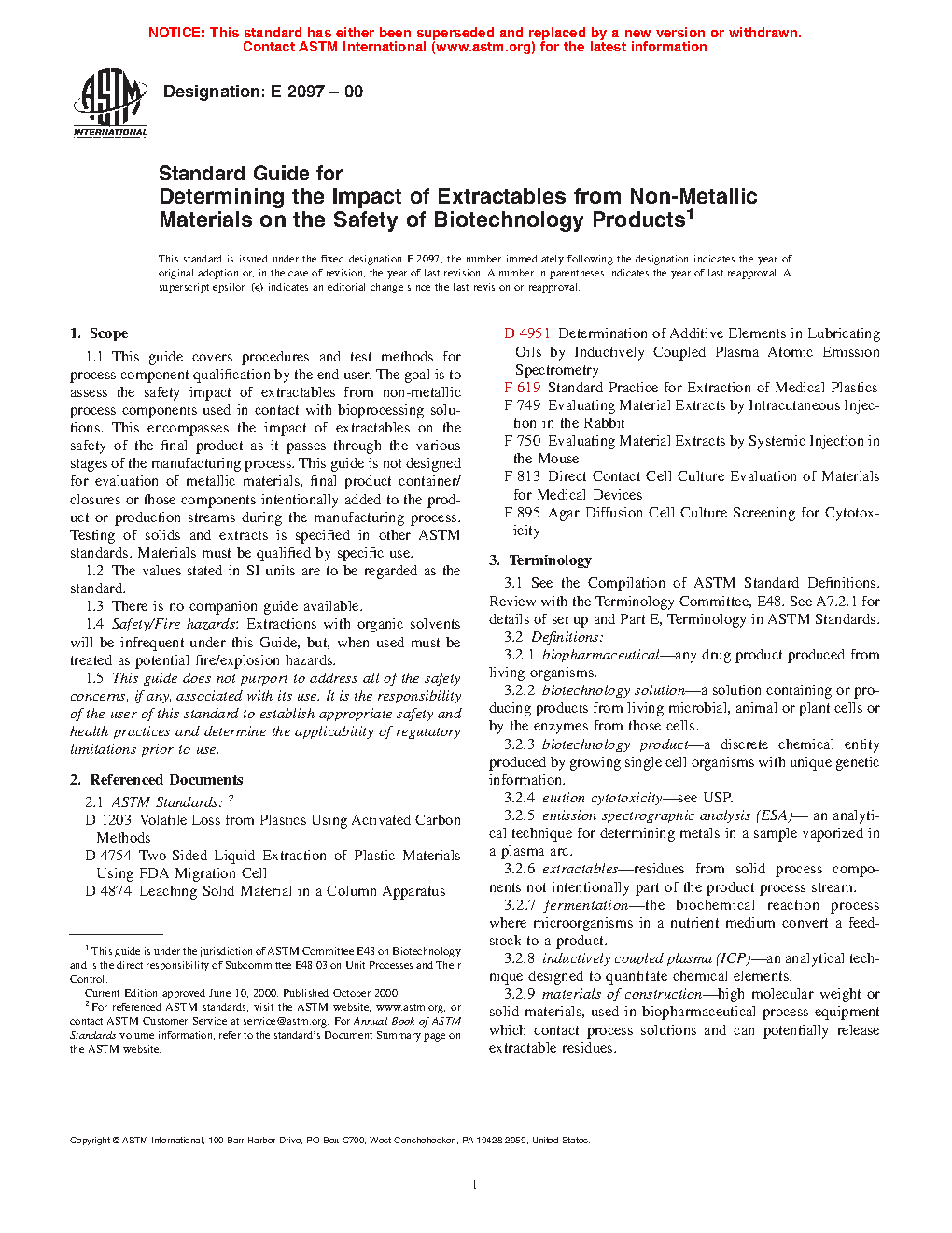 4.1 This guide applies to the determination of the safety of non-metallic materials used in contact with biotechnology product containing solutions. Process materials leach low level of residues into water, cell culture media, buffers, and other product containing solutions. This document offers guidance on determining the safety of these materials (process materials) for use. The goal is to prevent toxic extractables from entering process streams and ultimately contaminating the final product in unacceptable levels.