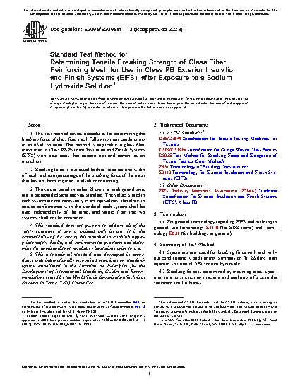 1.1 This test method covers procedures for determining the breaking force of glass fiber mesh following their conditioning in an alkali solution. The method is applicable to glass fiber mesh used in Exterior Insulation and Finish Systems (EIFS) and EIFS with drainage with base coats that contain portland cement as an ingredient.