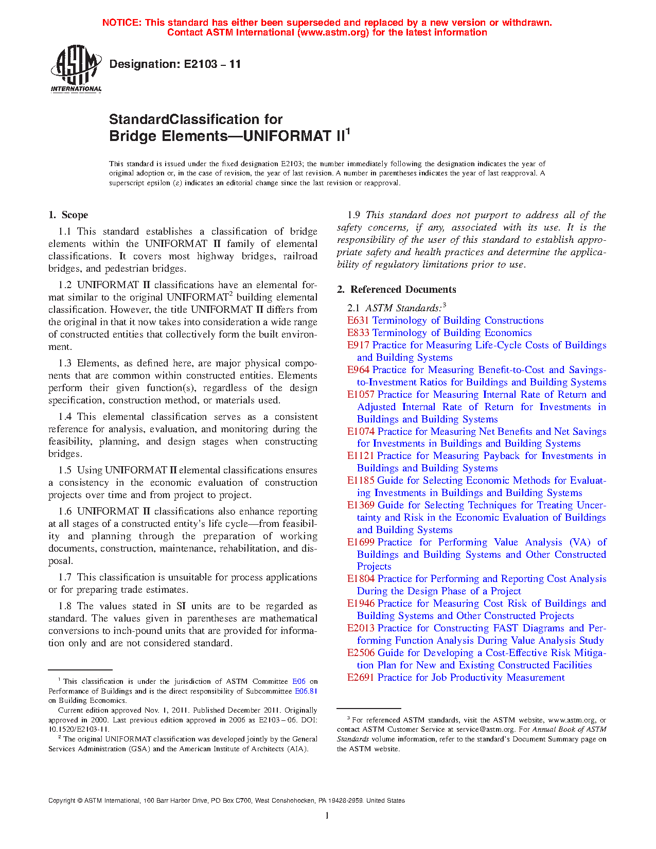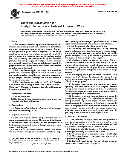 1.1 This classification covers bridge elements and related approach work. Elements, as defined here, are major components common to most bridges. Elements usually perform a given function, regardless of the design specification, construction method, or materials used. This classification serves as a consistent reference for analysis, evaluation, cost estimating, and monitoring during the feasibility, planning and design stages of bridges. It also enhances reporting at all stages from feasibility and planning through the preparation of working documents, construction, maintenance, rehabilitation, and disposal.