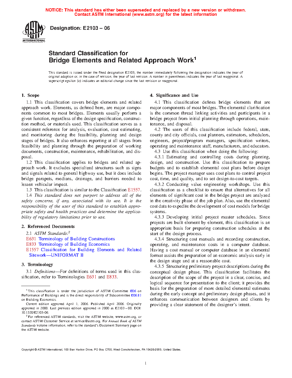 This classification defines bridge elements that are major components of most bridges. The elemental clarification is the common thread linking activities and participants in a bridge project from initial planning through operations, maintenance, and disposal.