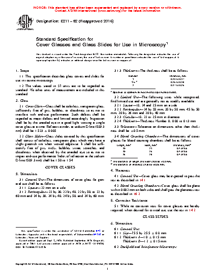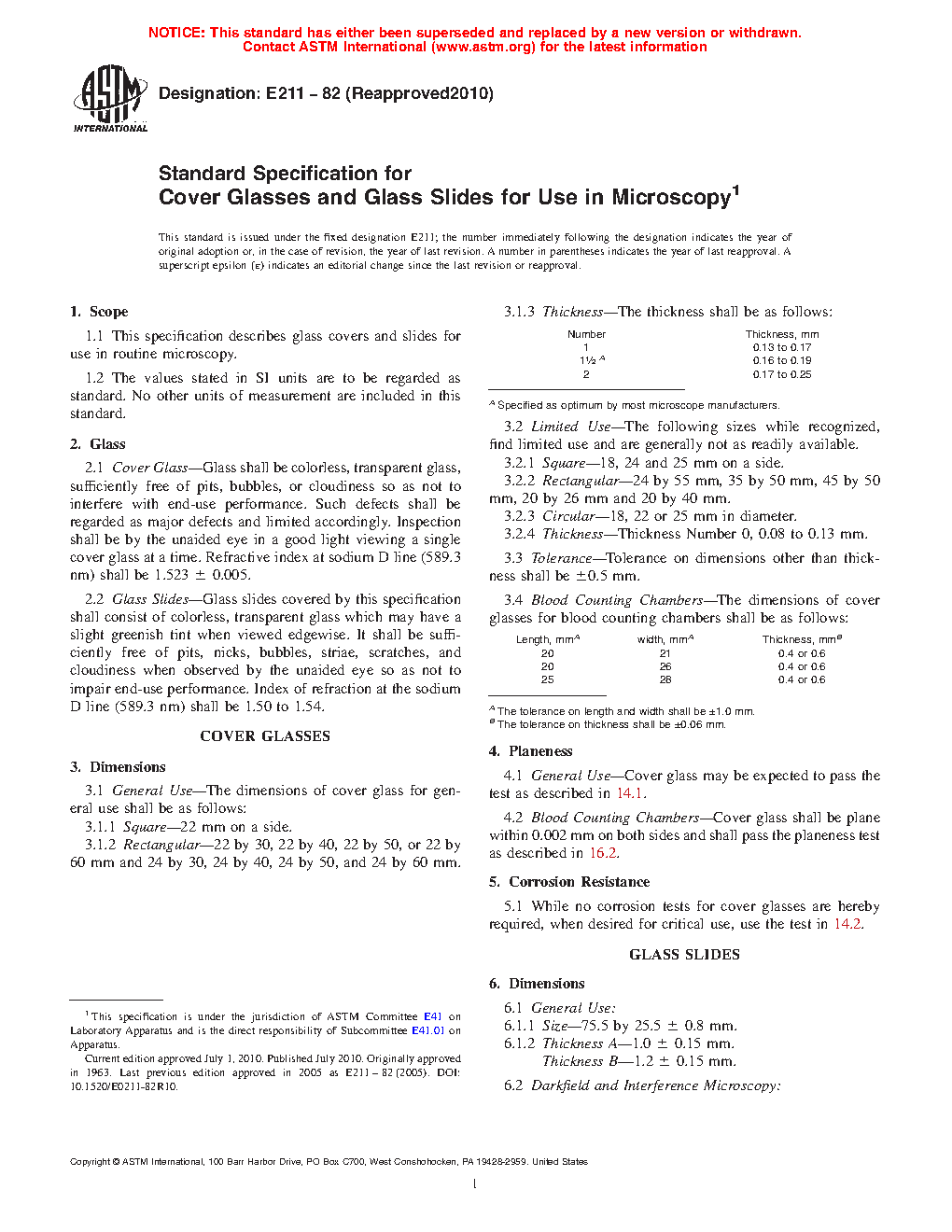 This specification describes the required properties and corresponding test methods for glass covers and slides for use in routine microscopy. The covers and slides comply to specified requirements as to dimension, planeness and parallelism, corrosion resistance, and workmanship. They shall also be tested for their conformance to other properties such as index of refraction, clarity, resistance to boiling, solubility, and wettability.