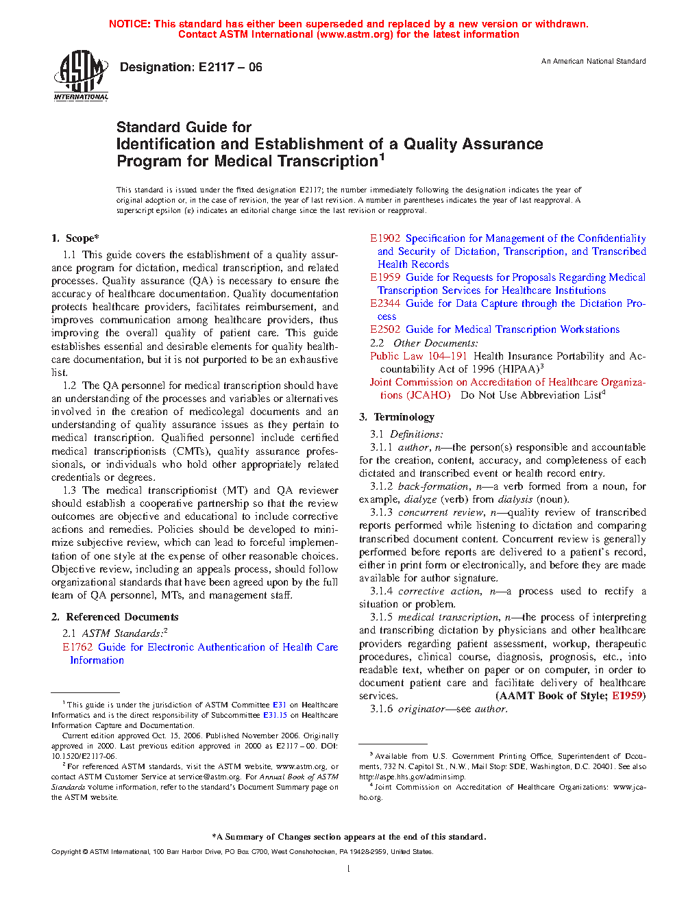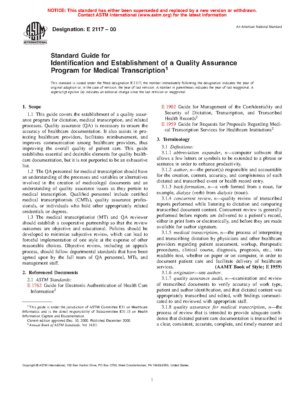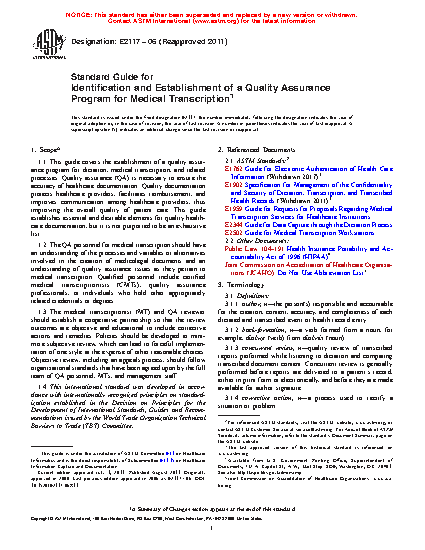 1.1 This guide covers the establishment of a quality assurance program for dictation, medical transcription, and related processes. Quality assurance (QA) is necessary to ensure the accuracy of healthcare documentation. It also assists in protecting healthcare providers, facilitates reimbursement, and improves communication among healthcare providers, thus improving the overall quality of patient care. This guide establishes essential and desirable elements for quality healthcare documentation, but it is not purported to be an exhaustive list.