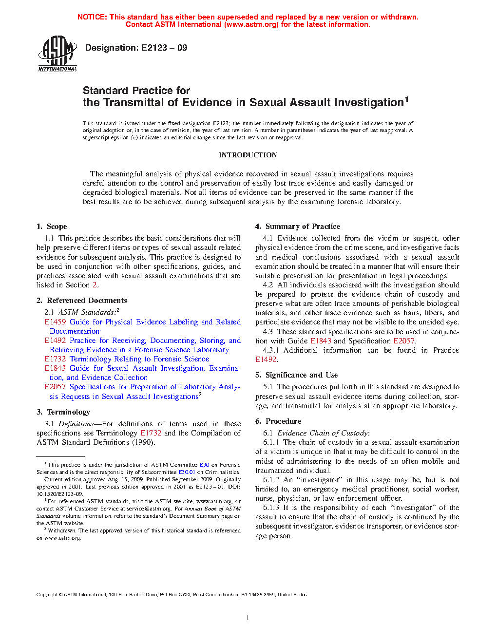 The procedures put forth in this standard are designed to preserve sexual assault evidence items during collection, storage, and transmittal for analysis at an appropriate laboratory.