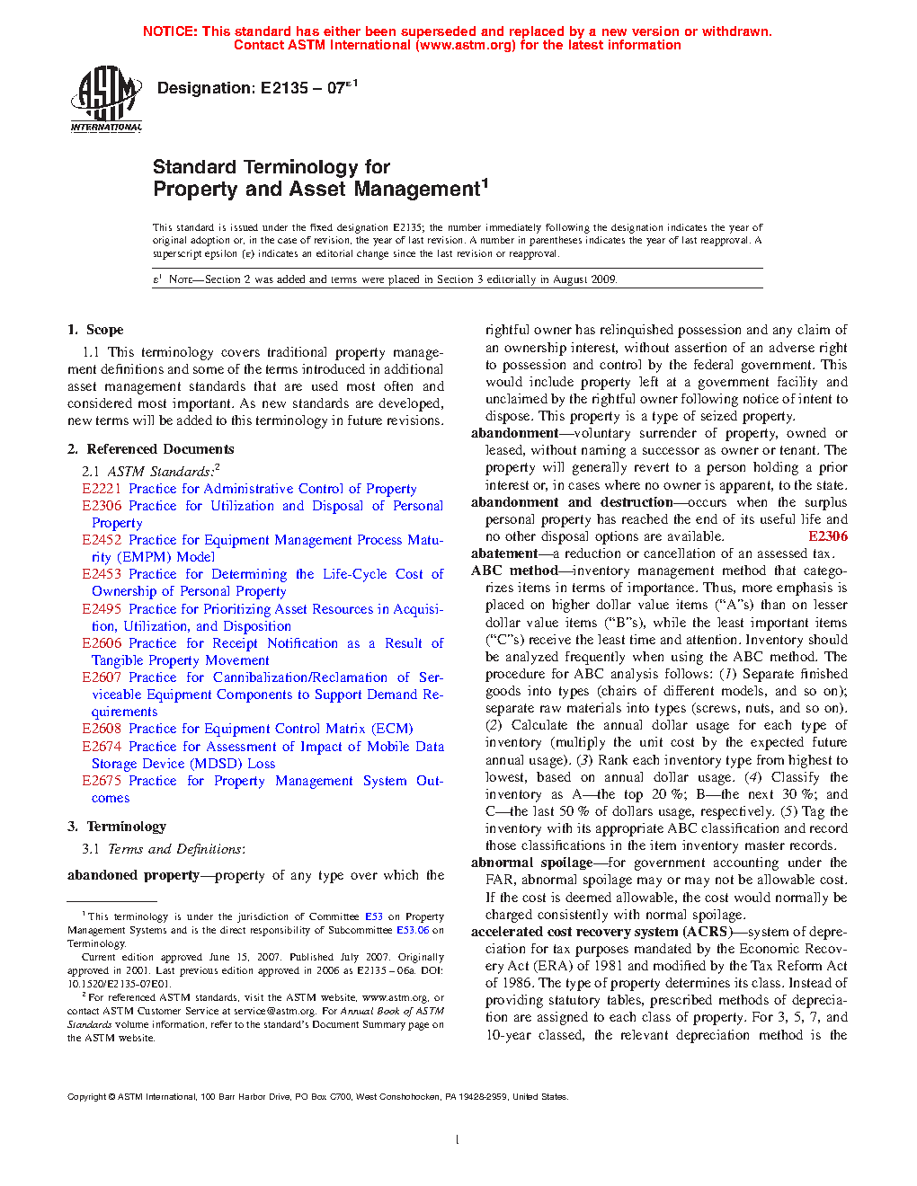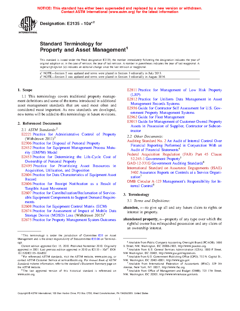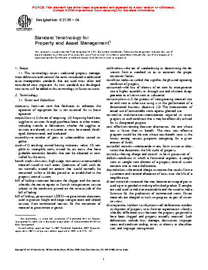 1.1 This terminology covers traditional property management definitions and some of the terms introduced in additional asset management standards that are used most often and considered most important. As new standards are developed, new terms will be added to this terminology in future revisions.