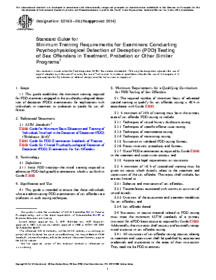 Standard Guide for Minimum Training Requirements for Examiners Conducting Psychophysiological Detection of Deception (PDD) Testing of Sex Offenders in Treatment, Probation or Other Similar Programs