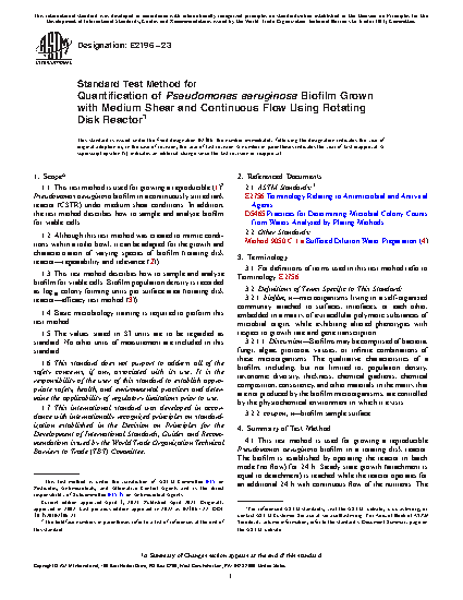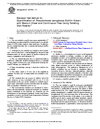 1.1 This test method is used for growing a reproducible (1)2 Pseudomonas aeruginosa biofilm in a continuously stirred tank reactor (CSTR) under medium shear conditions. In addition, the test method describes how to sample and analyze biofilm for viable cells.