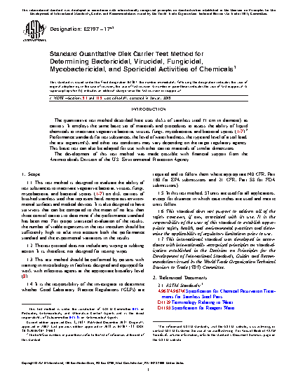 1.1 The method is designed to evaluate the ability of liquid chemical germicides to inactivate vegetative bacteria, viruses, fungi, mycobacteria and bacterial spores in the presence of a soil load (1,2) on disk carriers that represent environmental surfaces and medical devices. It is also designed to have survivors that can be compared to mean of no less than three control carriers to determine if the performance standard has been met. For proper statistical evaluation of the results, the size of the test inoculum should be sufficiently large to take into account both the performance standard and the experimental variation in the results.