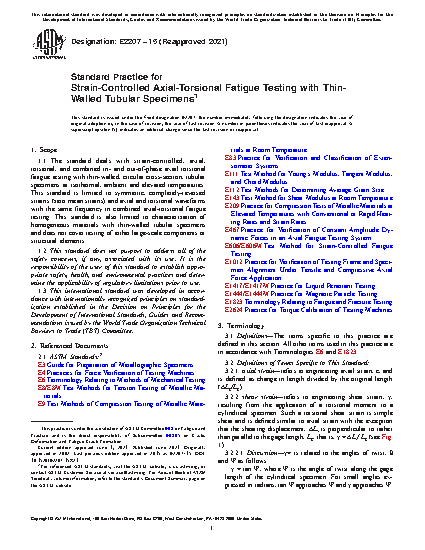 1.1 The standard deals with strain-controlled, axial, torsional, and combined in- and out-of-phase axial torsional fatigue testing with thin-walled, circular cross-section, tubular specimens at isothermal, ambient and elevated temperatures. This standard is limited to symmetric, completely-reversed strains (zero mean strains) and axial and torsional waveforms with the same frequency in combined axial-torsional fatigue testing. This standard is also limited to characterization of homogeneous materials with thin-walled tubular specimens and does not cover testing of either large-scale components or structural elements.