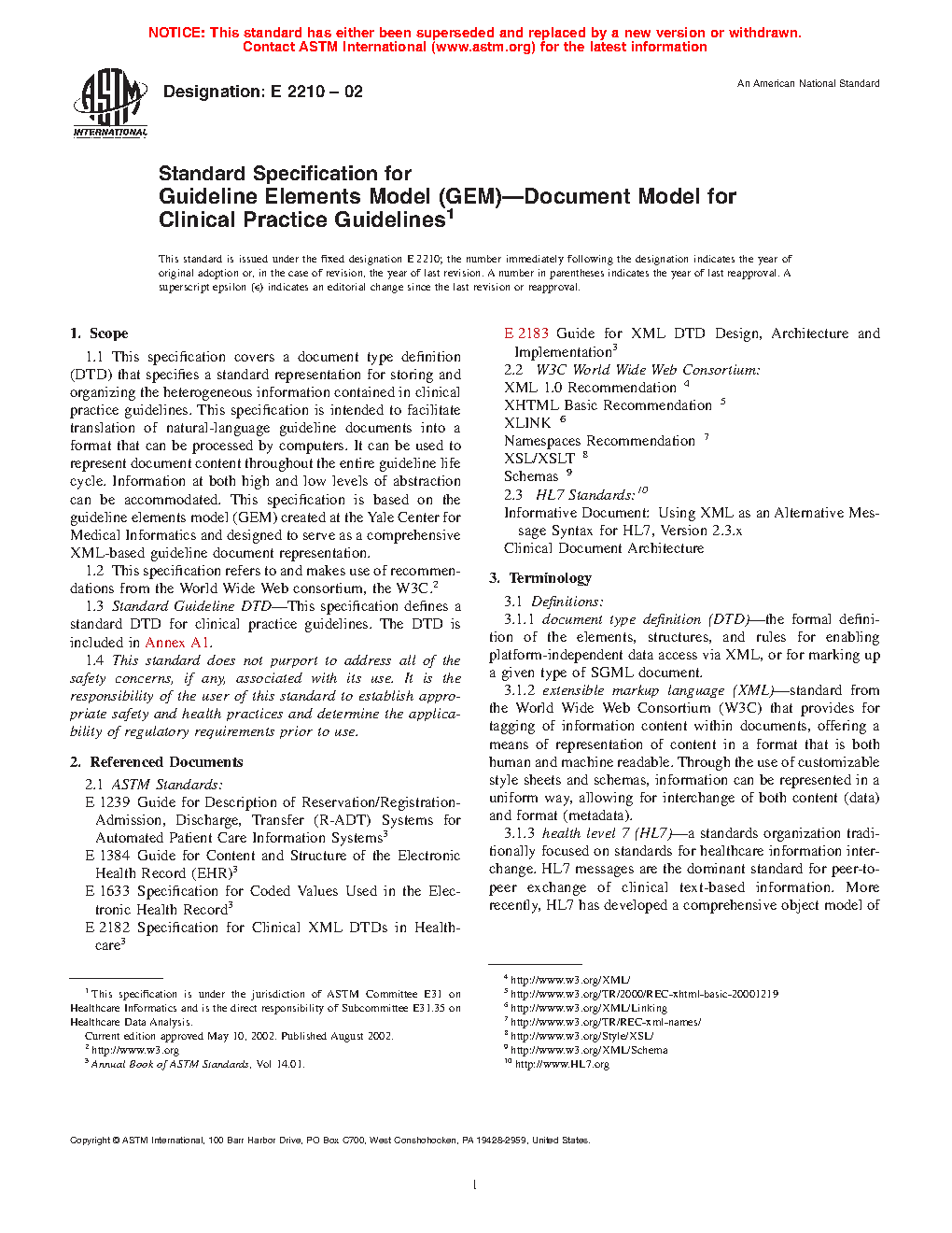 1.1 This specification updates a standard representation for storing and organizing the heterogeneous information contained in clinical practice guidelines. This specification is intended to facilitate translation of natural-language guideline documents into a format that can be processed by computers. It can be used to represent document content throughout the entire guideline life cycle. Information at both high and low levels of abstraction can be accommodated. This specification is based on the guideline elements model (GEM) created at the Yale Center for Medical Informatics and designed to serve as a comprehensive XML-based guideline document representation.