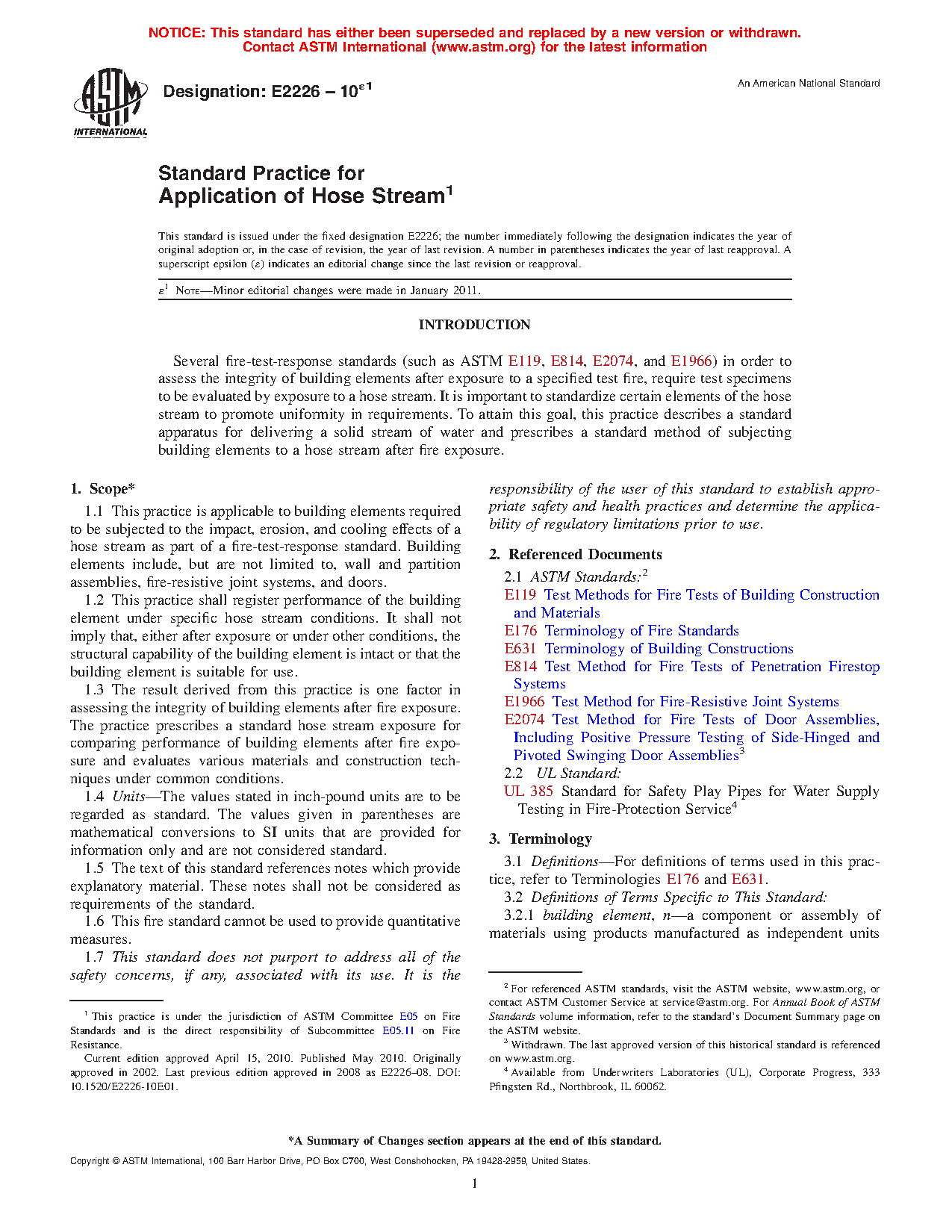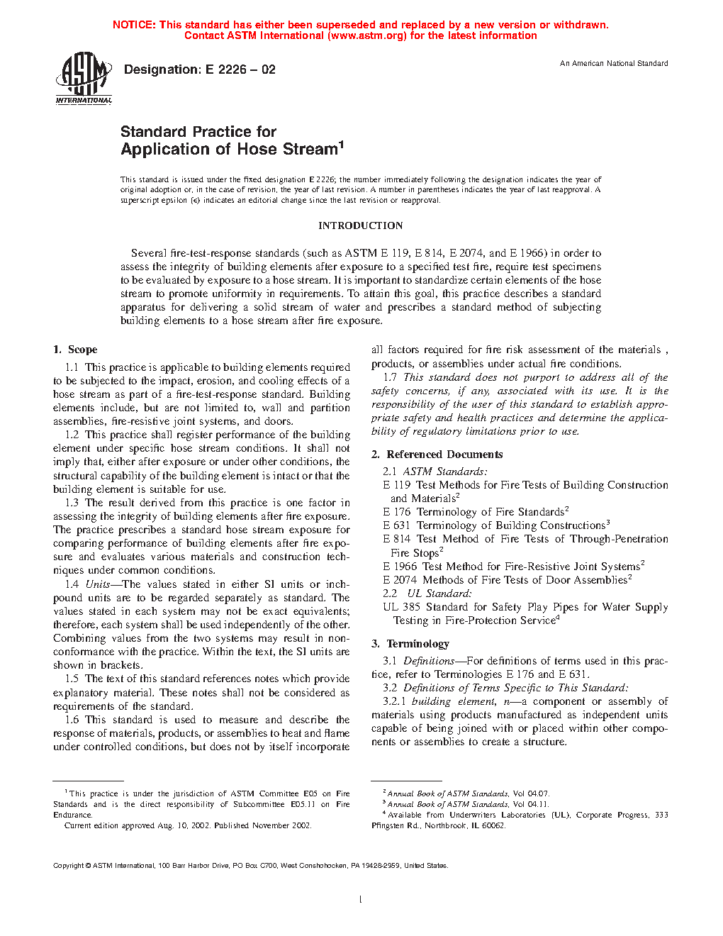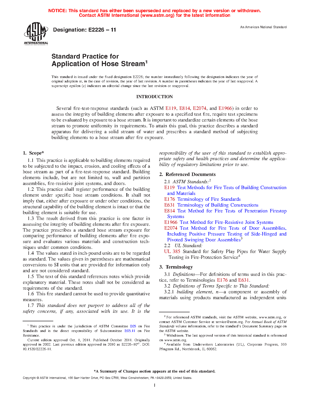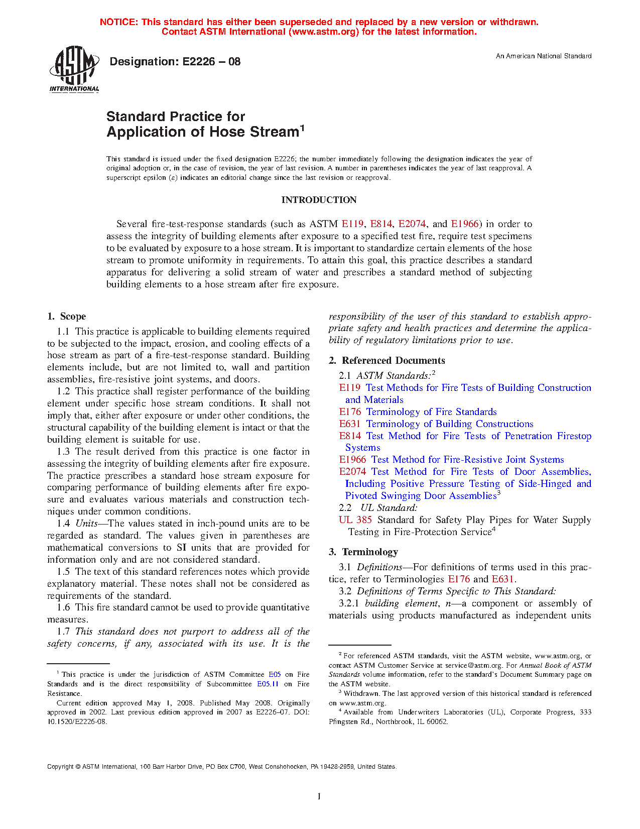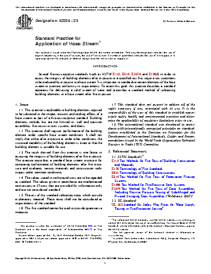 1.3 The result derived from this practice is one factor in assessing the integrity of building elements after fire exposure. The practice prescribes a standard hose stream exposure for comparing performance of building elements after fire exposure and evaluates various materials and construction techniques under common conditions.