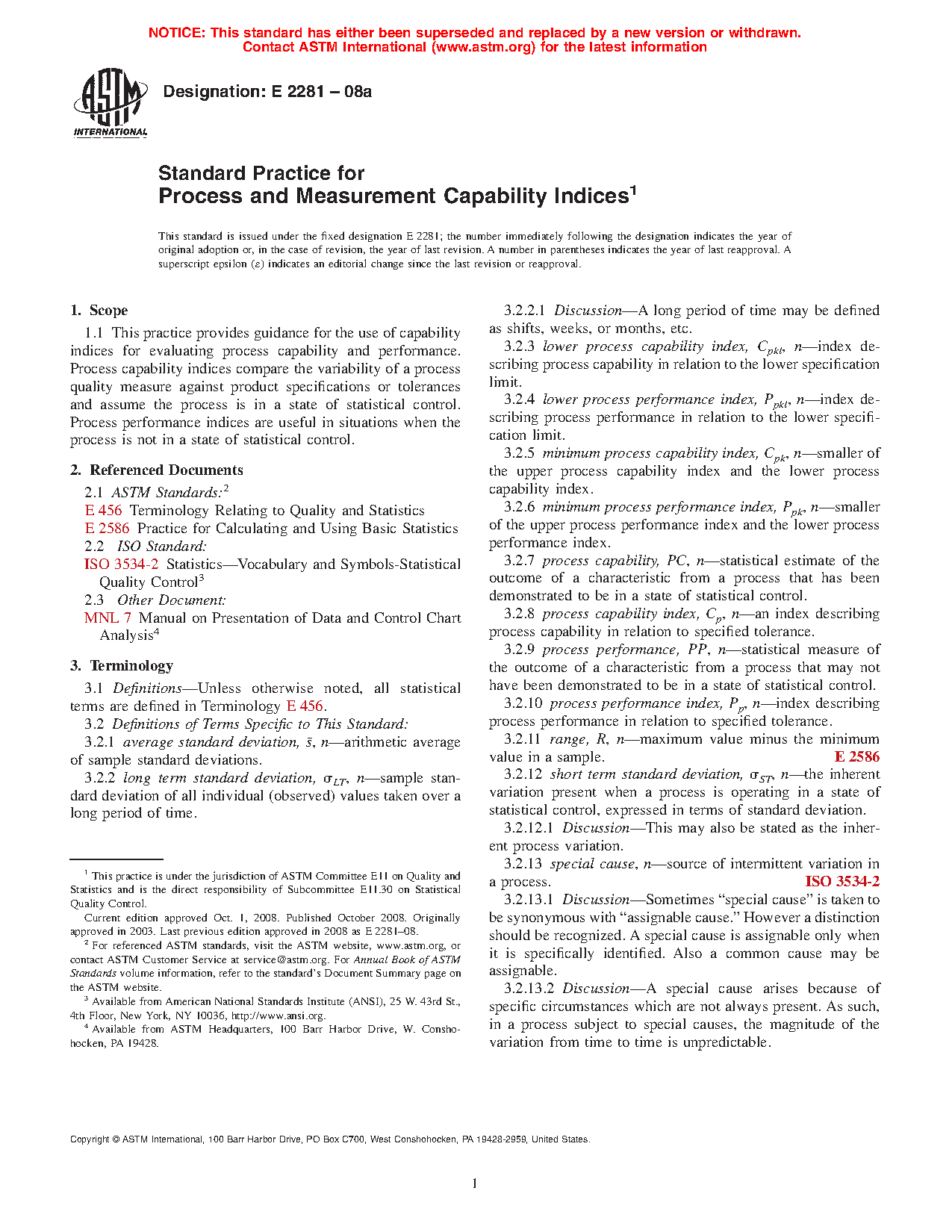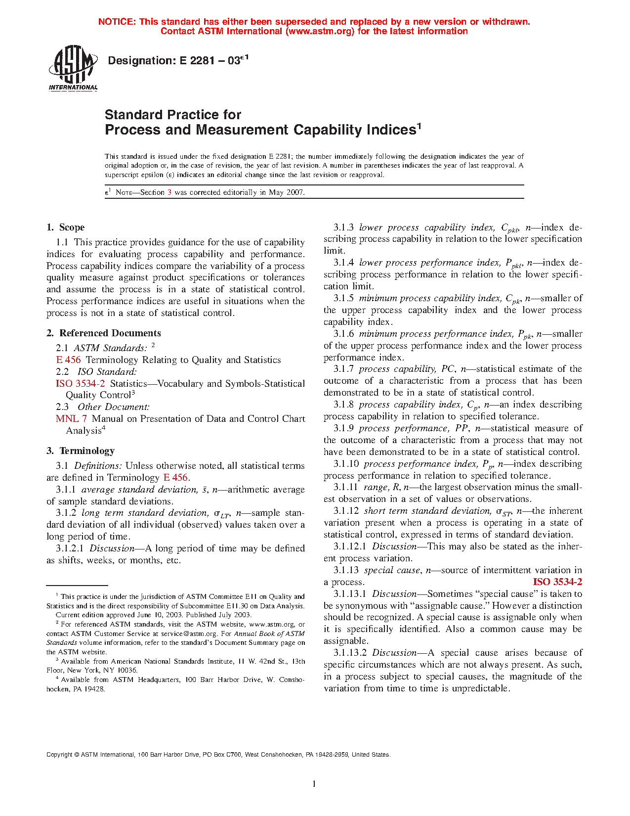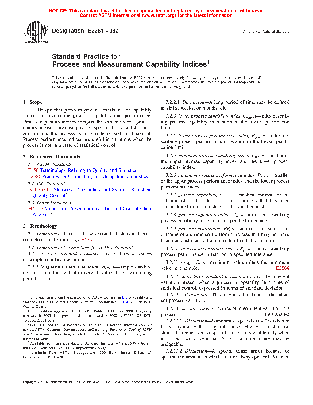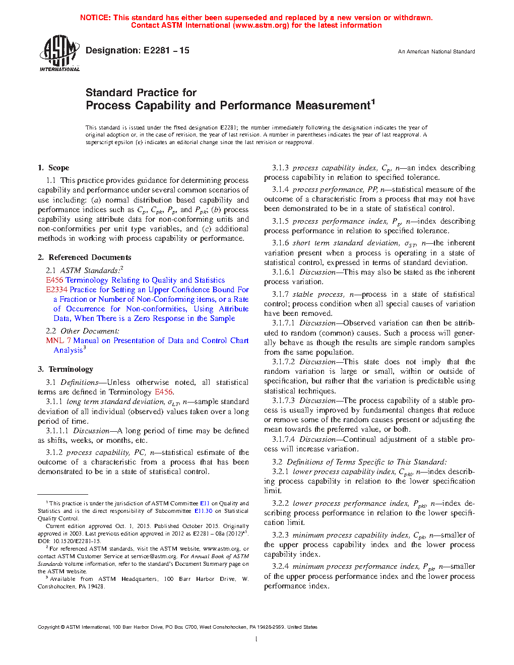 1.1 This practice provides guidance for the use of capability indices for evaluating process capability and performance. Process capability indices compare the variability of a process quality measure against product specifications or tolerances and assume the process is in a state of statistical control. Process performance indices are useful in situations when the process is not in a state of statistical control.