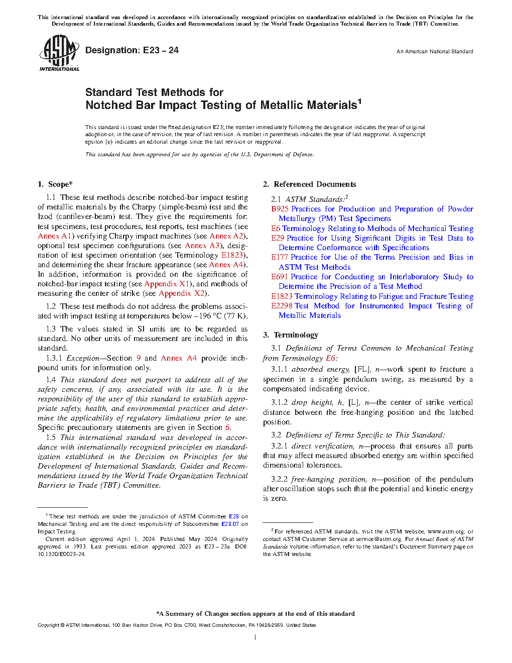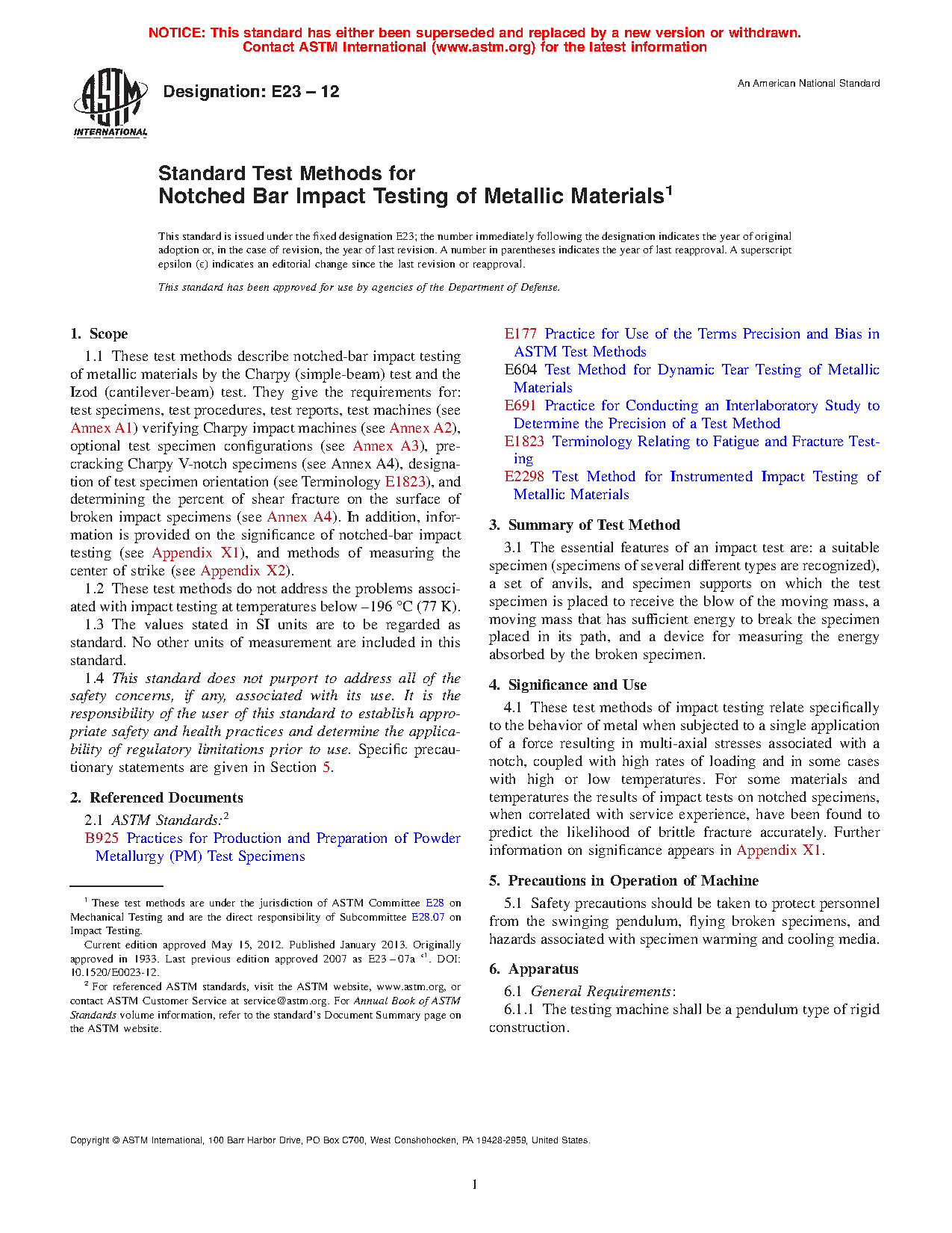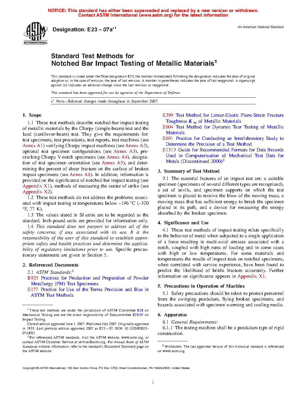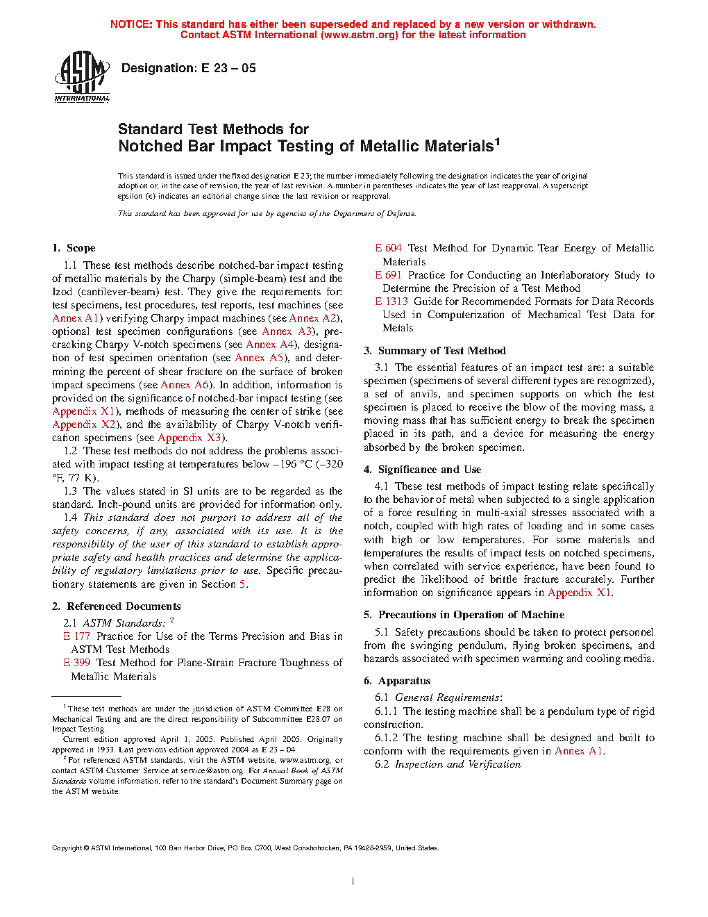 1.1 These test methods describe notched-bar impact testing of metallic materials by the Charpy (simple-beam) test and the Izod (cantilever-beam) test. They give the requirements for: test specimens, test procedures, test reports, test machines (see Annex A1) verifying Charpy impact machines (see Annex A2), optional test specimen configurations (see Annex A3), designation of test specimen orientation (see Terminology E1823), and determining the percent of shear fracture on the surface of broken impact specimens (see Annex A4). In addition, information is provided on the significance of notched-bar impact testing (see Appendix X1), and methods of measuring the center of strike (see Appendix X2).
