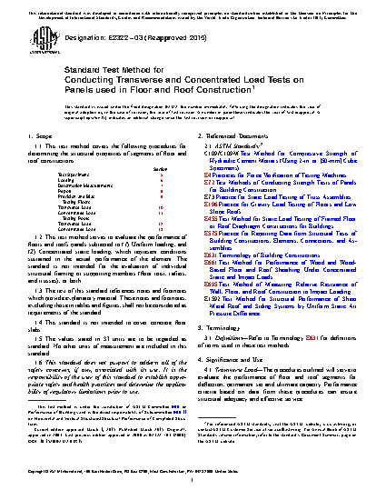 4.1 Transverse Load—The procedures outlined will serve to evaluate the performance of floor and roof segments for deflection, permanent set and ultimate capacity. Performance criteria based on data from these procedures can ensure structural adequacy and effective service.
